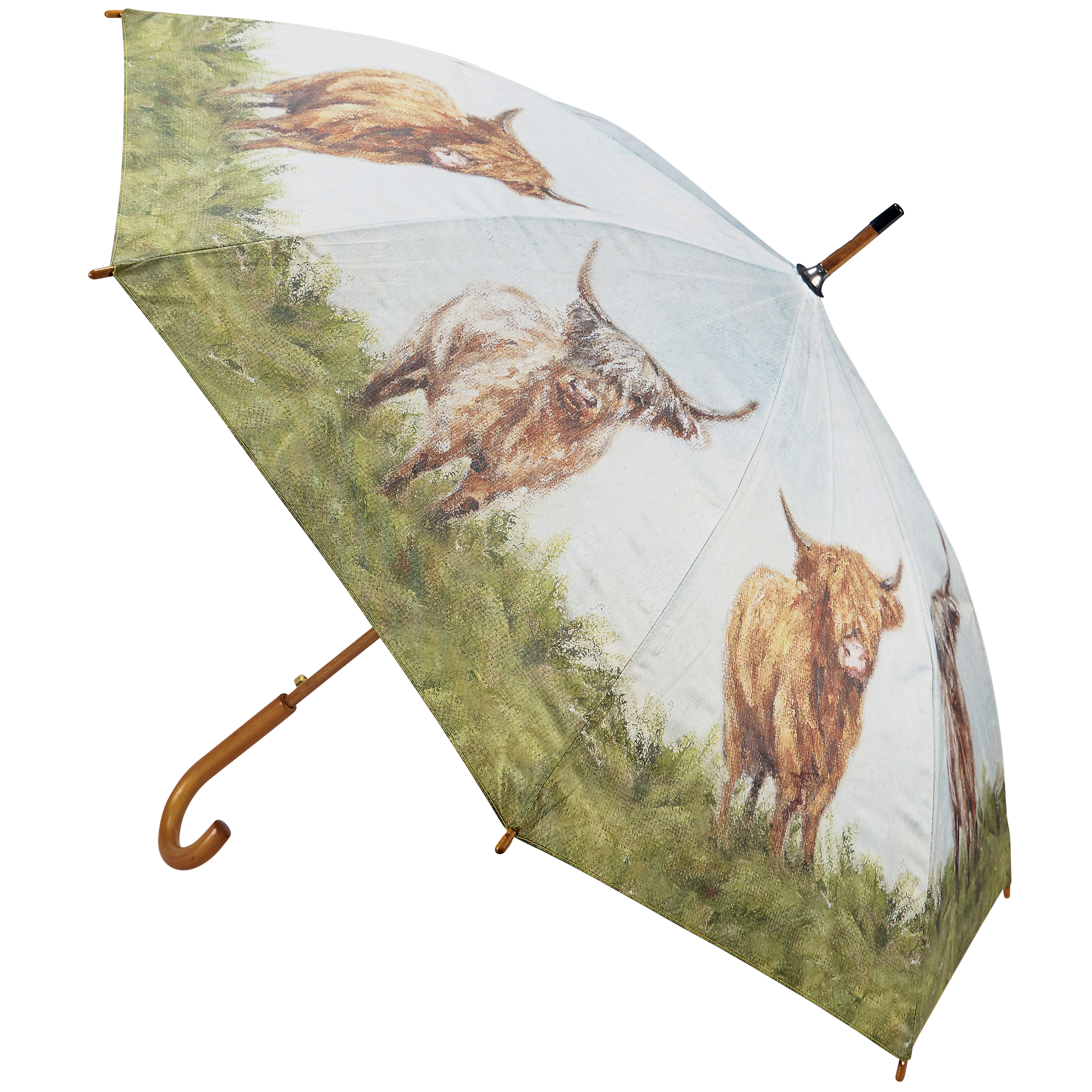 A stylish umbrella from our Farmhouse displaying full color designs of highland cows in a field on the canopy. Highland cows designs are replicated from original artwork painted onto burlap canvas, giving the art a unique depth and texture. Farm umbrella is a classic design featuring a durable curved wooden handle with easy to open canopy and push button to collapse and tie shut with coordinating strap. Our Highland Cows umbrella canopy features a spread of over 40 inches for plenty of coverage from the weather. A rustic farm-themed accessory that is great for gifting.