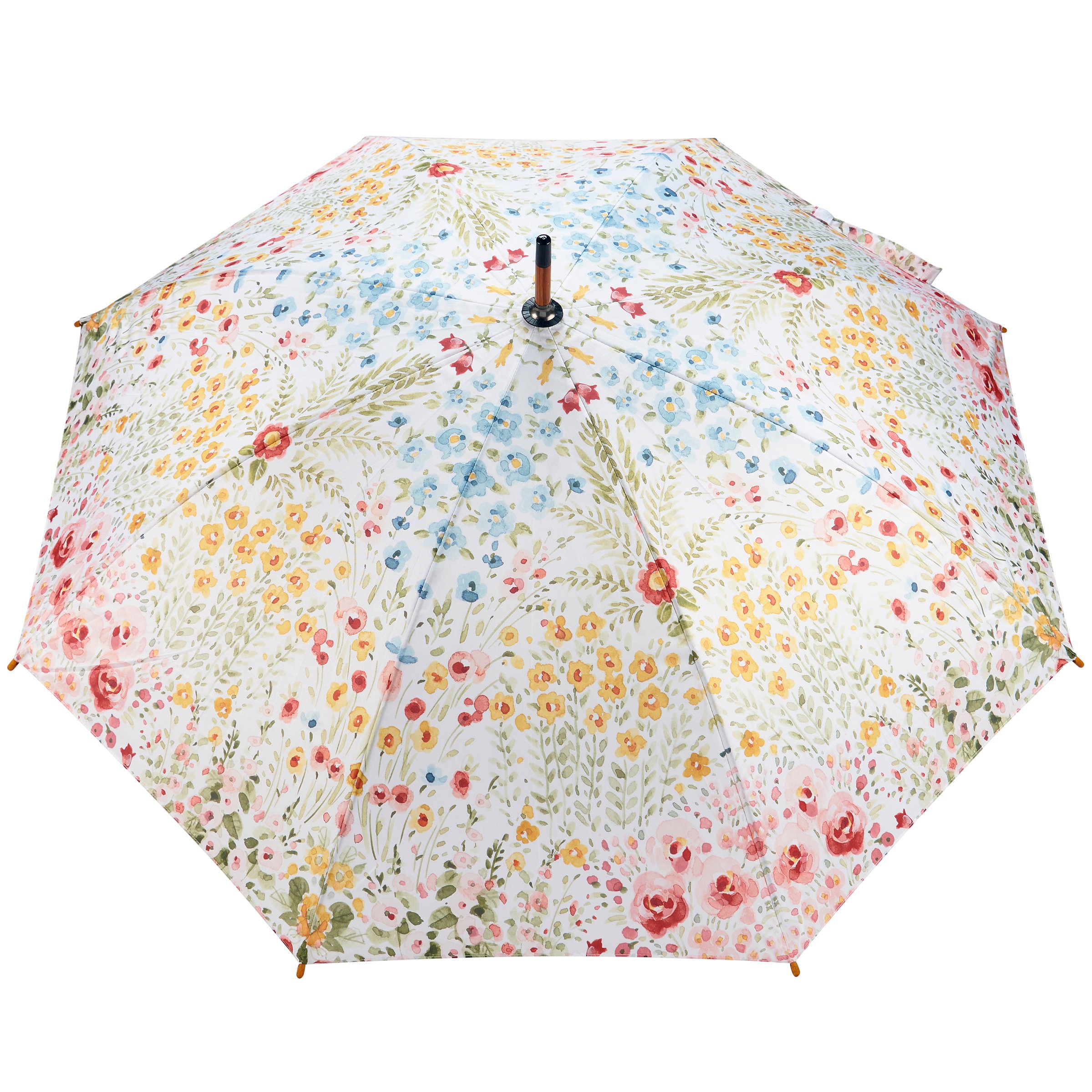 A stylish umbrella from our Watercolor Collection displaying full color designs of mixed floral inspired by nature on the canopy. Floral designs are replicated from original art hand painted in a delicate watercolor style.The Floral umbrella is a classic design featuring a durable curved wooden handle with easy to open canopy and push button to collapse and tie shut with coordinating strap. Our Mixed Floral umbrella canopy features a spread of over 40 inches for plenty of coverage from the weather. A nature-themed accessory that is great for gifting.