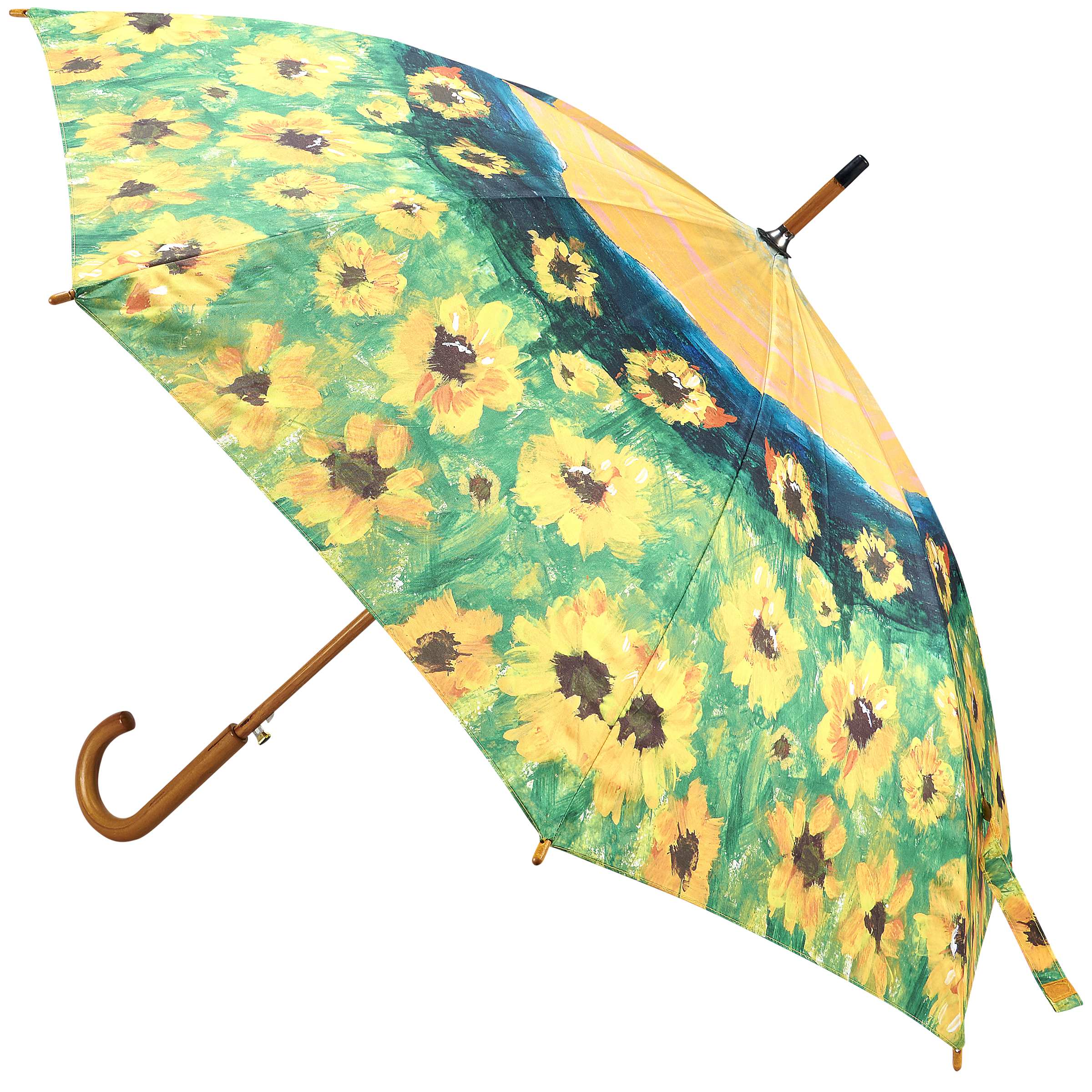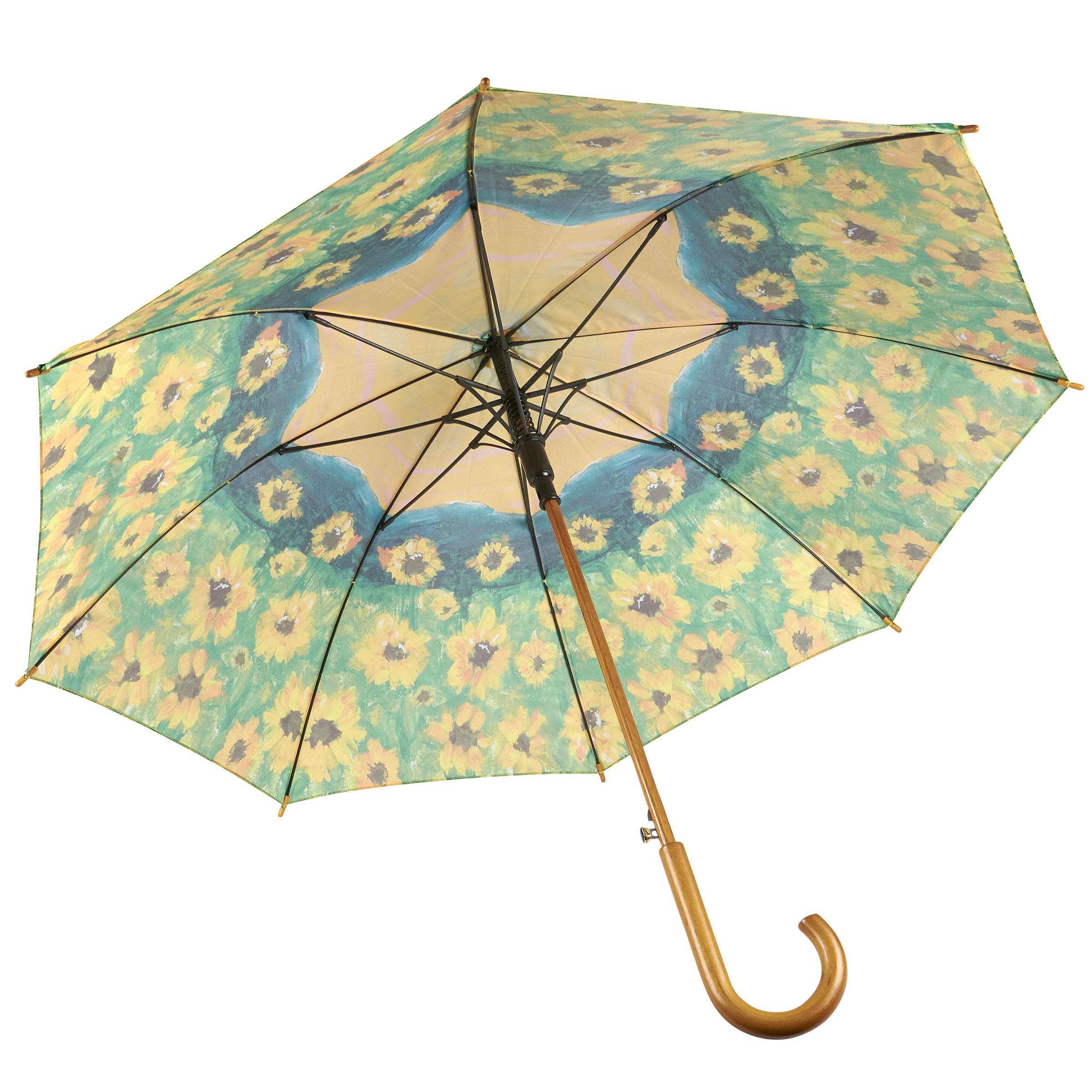 A stylish umbrella from our Friendship Heart Gallery displaying a full color design of sunflower fields on the canopy. Sunflower design is replicated from original art created at the Friendship Heart Gallery in downtown Lancaster, PA that supports artists with intellectual disabilities and autism. Artful umbrella is a classic design featuring a durable curved wooden handle with easy to open canopy and push button to collapse and tie shut with coordinating strap. Our Sunflower Fields umbrella canopy features a spread of over 40 inches for plenty of coverage from the weather. A stylish everyday accessory that is great for gifting.