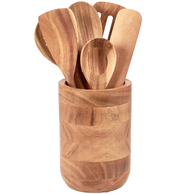 A wooden utensil holder displaying a simple acacia wood design that coordinates well with simple farm kitchen accessories from ourĀ Cottagecore Collection. Our Acacia Wood utensil holder can hold a variety of utensils. Accessories pictured not included. Hand wash only. A rustic everyday kitchen accessory that blends with a variety of styles.