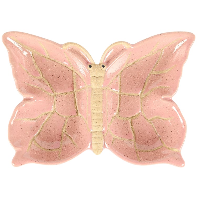 A ceramic vanity tray from our Art Nouveau Collection displaying a sculpted butterfly design with painted details and speckled pink glaze finish. Our Pink Butterfly vanity tray is perfect for holding daily keepsakes. Accessories pictured not included. A vintage nature-themed home accent great for gifting.