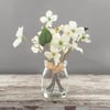 A small glass vase featuring a dogwood blossom bouquet from our Botanical Collection. Contains a silicone bottom fill to resemble water. Complements well with coordinating pieces in collection for a charming indoor garden.
