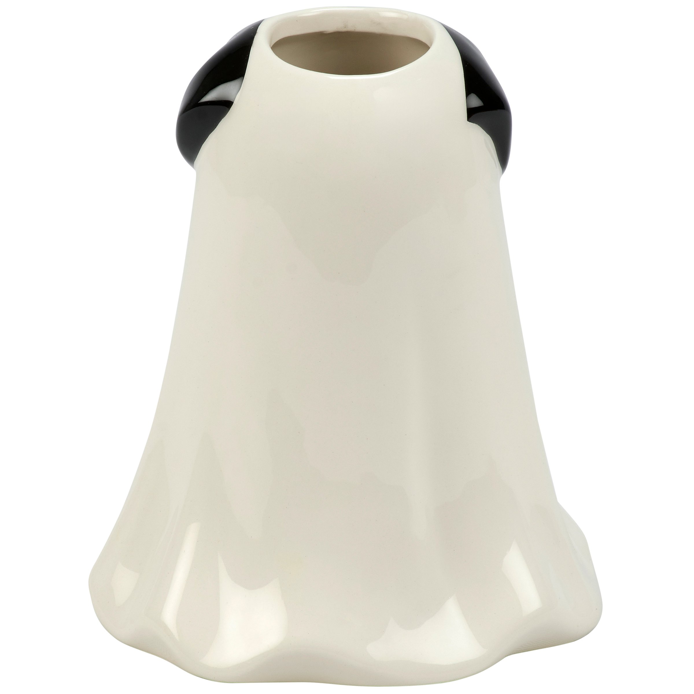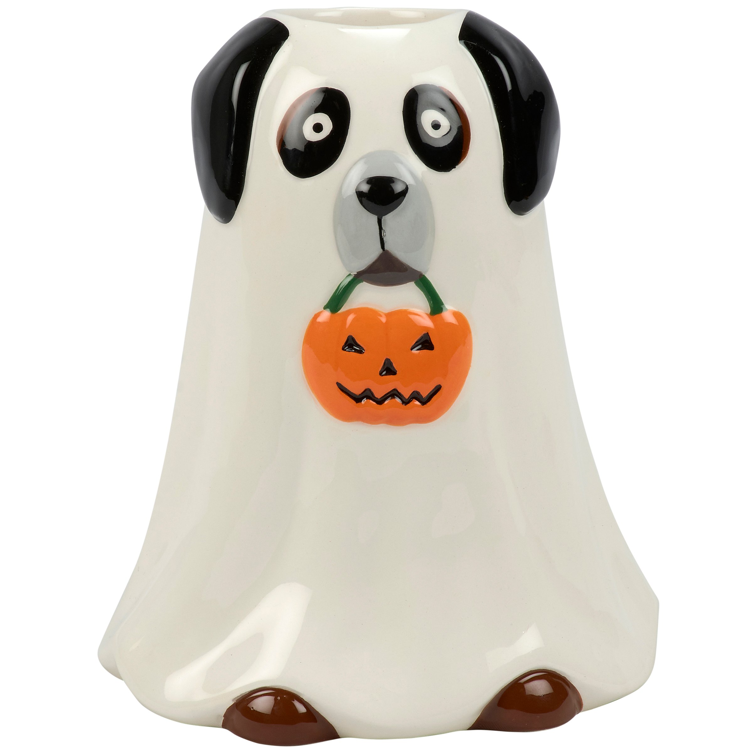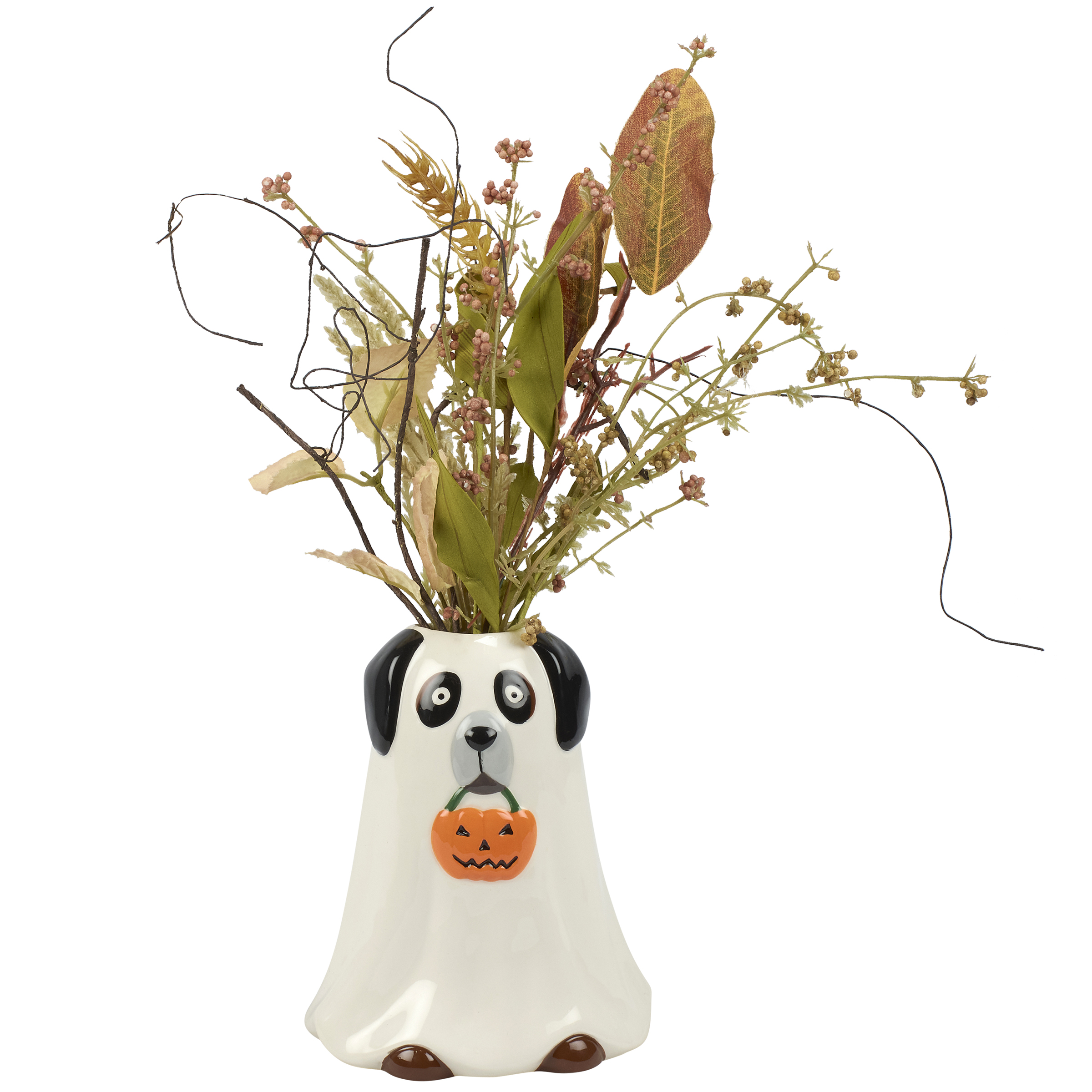 A ceramic vase from our Halloween Collection displaying a sculpted design of a dog wearing a ghost costume holding a treat bucket in its mouth with a colorful glaze finish. Our Ghost Dog vase features opening on top to place fall foliage and botanicals. Accessories pictured not included. A fun pet-themed Halloween home accent with a variety of seasonal display options.