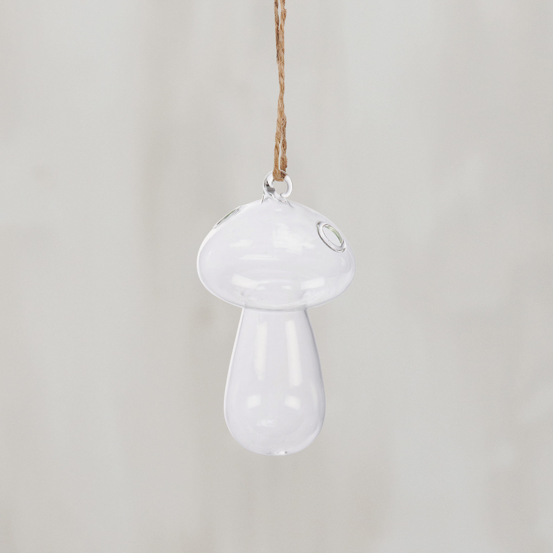 A glass vase from our Cottagecore Collection displaying a mushroom design. Vase features hole for small stemmed florals and clear glass to see full floral. Greenery pictured not included. Our Hanging Mushroom vase includes jute hanger for option to suspend in air. A neutral everyday home accent with a variety of display options.
