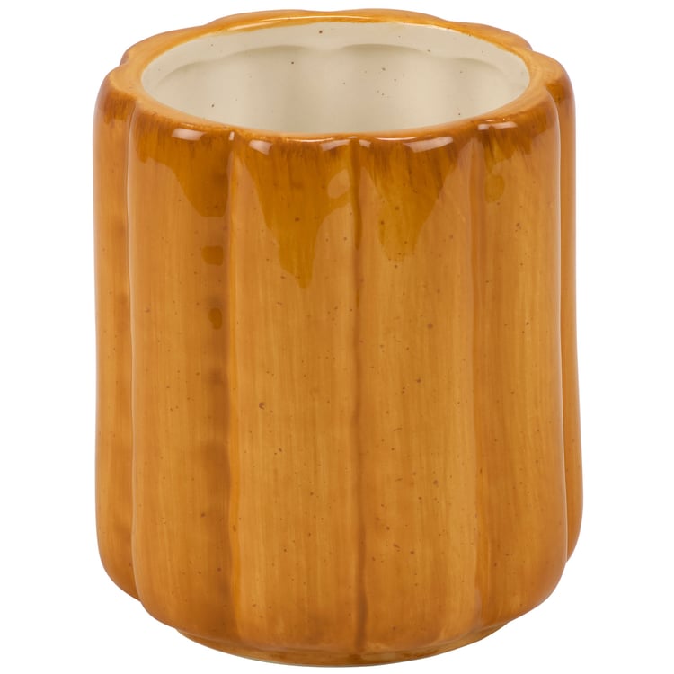 A ceramic vase from our Halloween Collection displaying a sculpted jack o'lantern design with a orange glaze finish and painted details. Our Jack O'Lantern vase features opening on top to place fall foliage and botanicals. Accessories pictured not included. A fun Halloween home accent with a variety of seasonal display options.