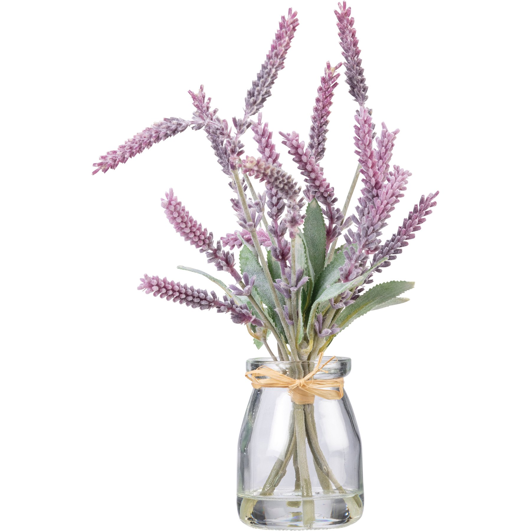 A small glass vase featuring a lavender bouquet from our Botanical Collection. Contains a silicone bottom fill to resemble water. Complements well with coordinating pieces in collection for a charming indoor garden.