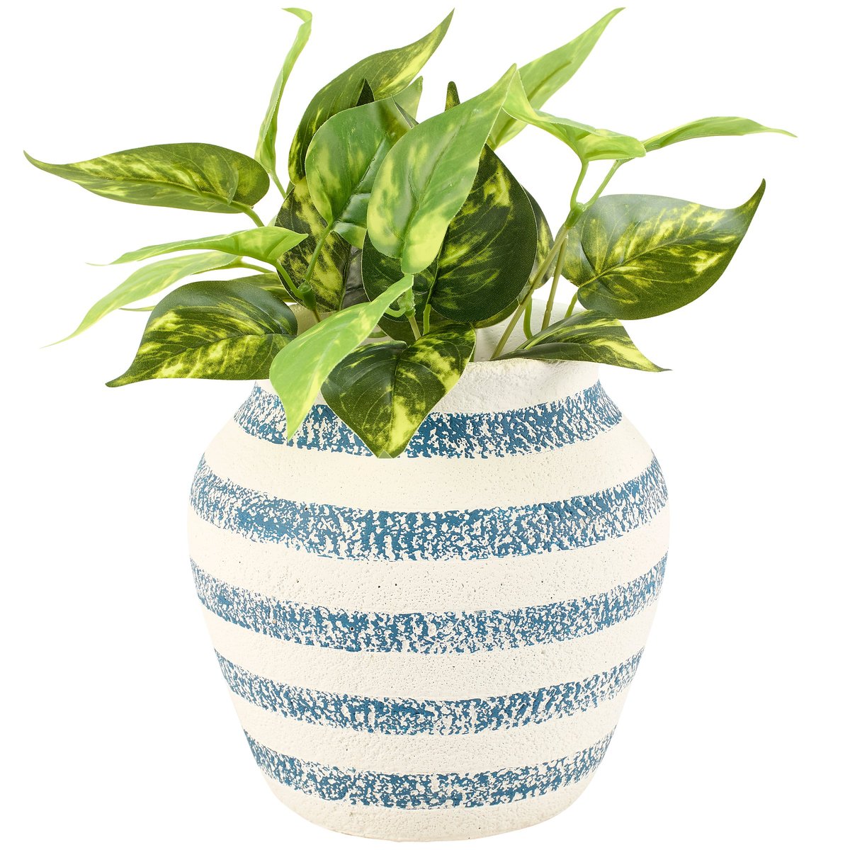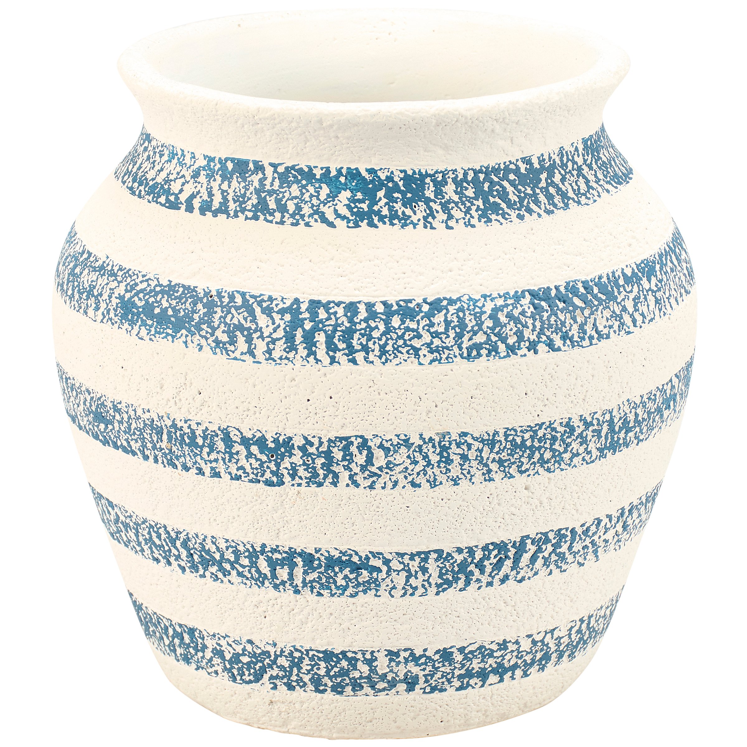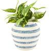 A cement vase from our Beach Collection displaying a navy blue and cream stripe design. Our Navy Stripe vase features opening on top to place greenery. Greenery pictured not included. A rustic beach-themed home accent with a variety of display options.