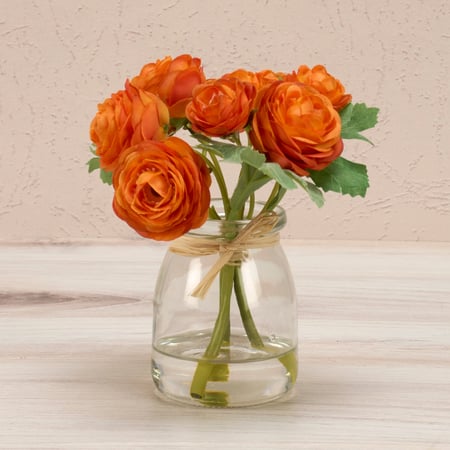 A small glass vase from our Botanical Collection featuring a delightful orange roses bouquet. Faux plants bring botanical vibes to any space with zero maintenance. Vase bottom contains a silicone fill to resemble water. Our Orange Roses vase complements well with coordinating pieces in collection for a charming display. Complete as shown. A floral-themed home accent perfect for easily adding natural style where real plants cannot thrive.