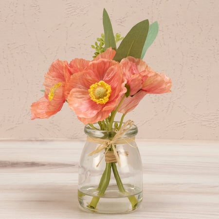 A small glass vase from our Botanical Collection featuring a delightful peach poppies bouquet. Faux plants bring botanical vibes to any space with zero maintenance. Vase bottom contains a silicone fill to resemble water. Our Peach Poppies vase complements well with coordinating pieces in collection for a charming display. Complete as shown. A floral-themed home accent perfect for easily adding natural style where real plants cannot thrive.