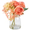 A small glass vase from our Botanical Collection featuring a delightful peach roses bouquet. Faux plants bring botanical vibes to any space with zero maintenance. Vase bottom contains a silicone fill to resemble water. Our Peach Roses vase complements well with coordinating pieces in collection for a charming display. Complete as shown. A floral-themed home accent perfect for easily adding natural style where real plants cannot thrive.