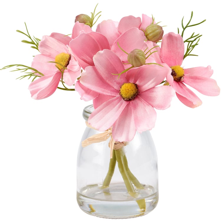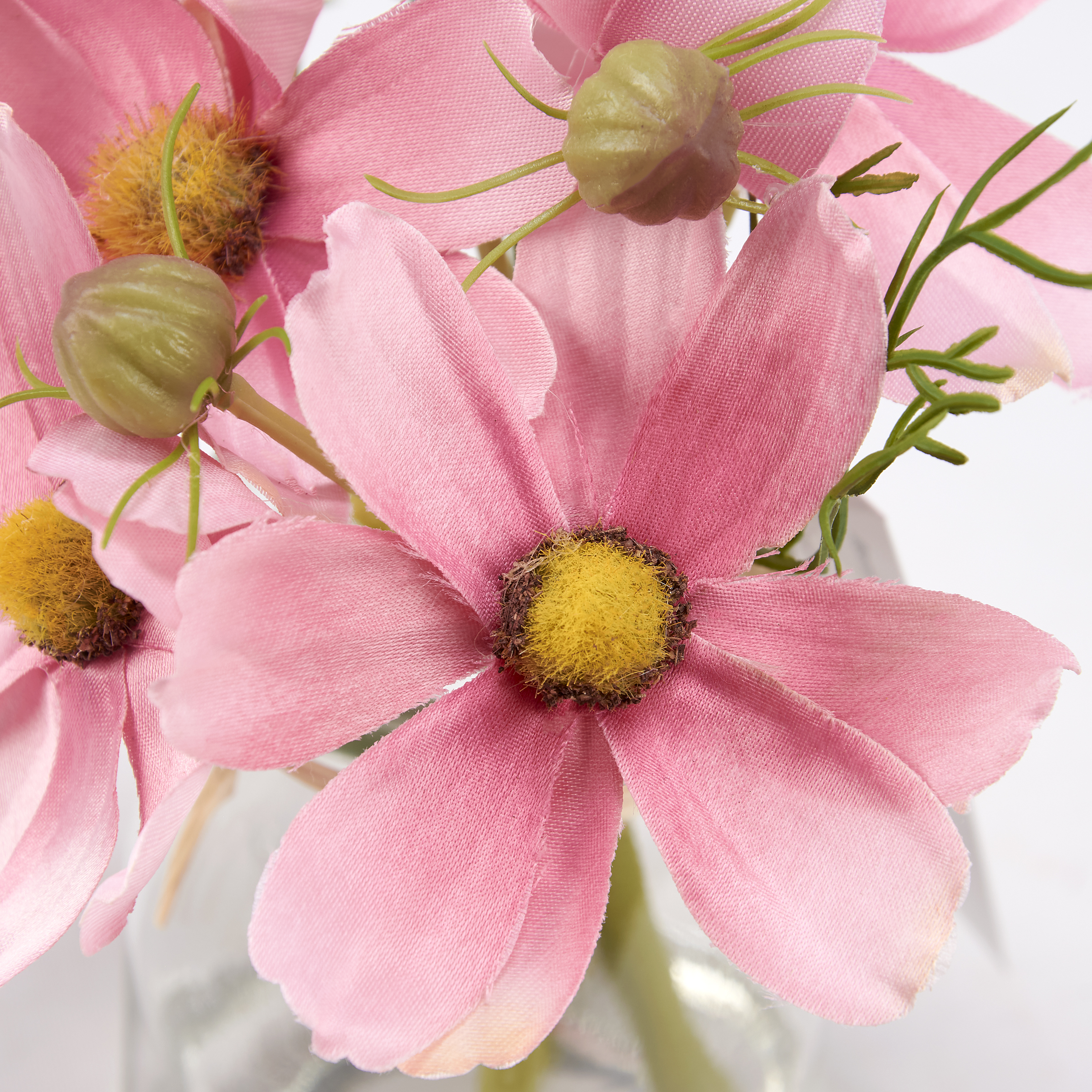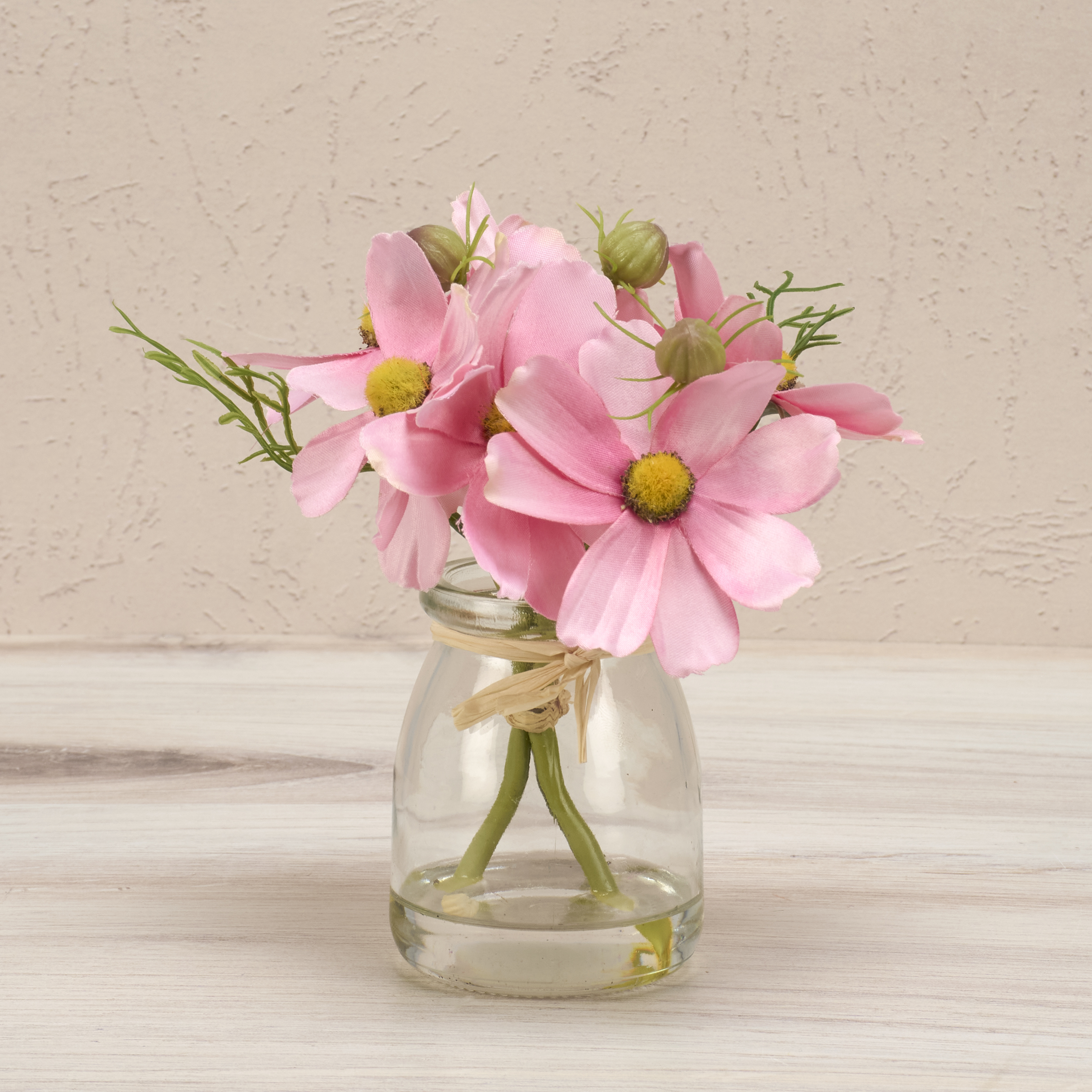 A small glass vase from our Botanical Collection featuring a delightful pink cosmos bouquet. Faux plants bring botanical vibes to any space with zero maintenance. Vase bottom contains a silicone fill to resemble water. Our Pink Cosmos vase complements well with coordinating pieces in collection for a charming display. Complete as shown. A floral-themed home accent perfect for easily adding natural style where real plants cannot thrive.
