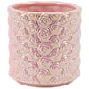 A ceramic vase from our Mother's Day Collection displaying a sculpted roses design around the outside with a pink iridescent glaze finish throughout for added interest. Our Pink Roses vase features opening on top to place greenery. Greenery pictured not included. A lovely Mother's Day gift perfect for everyday floral displays.