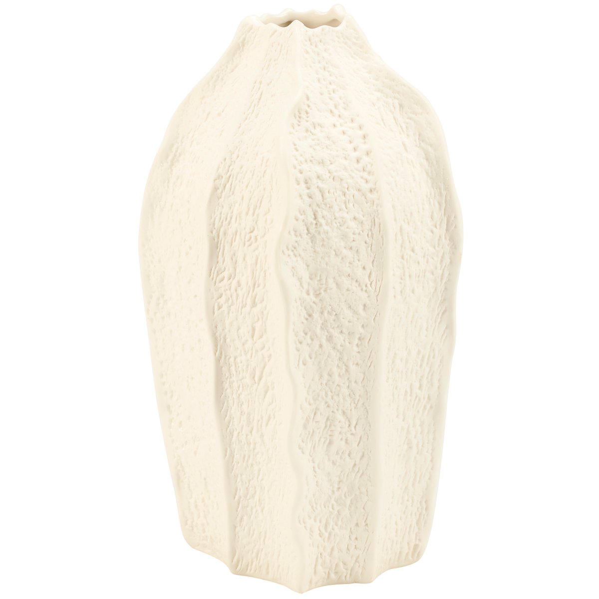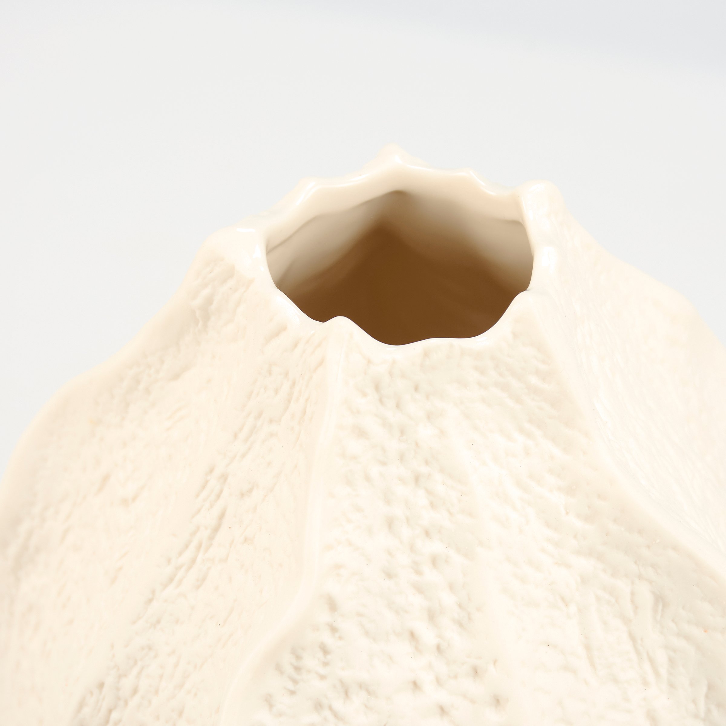 A porcelain vase from our Beach Collection displaying a tall sculpted sea urchin shape with cream finish. Our Sea Urchin vase features opening on top to place greenery. Greenery pictured not included. A rustic beach-themed home accent with a variety of display options.