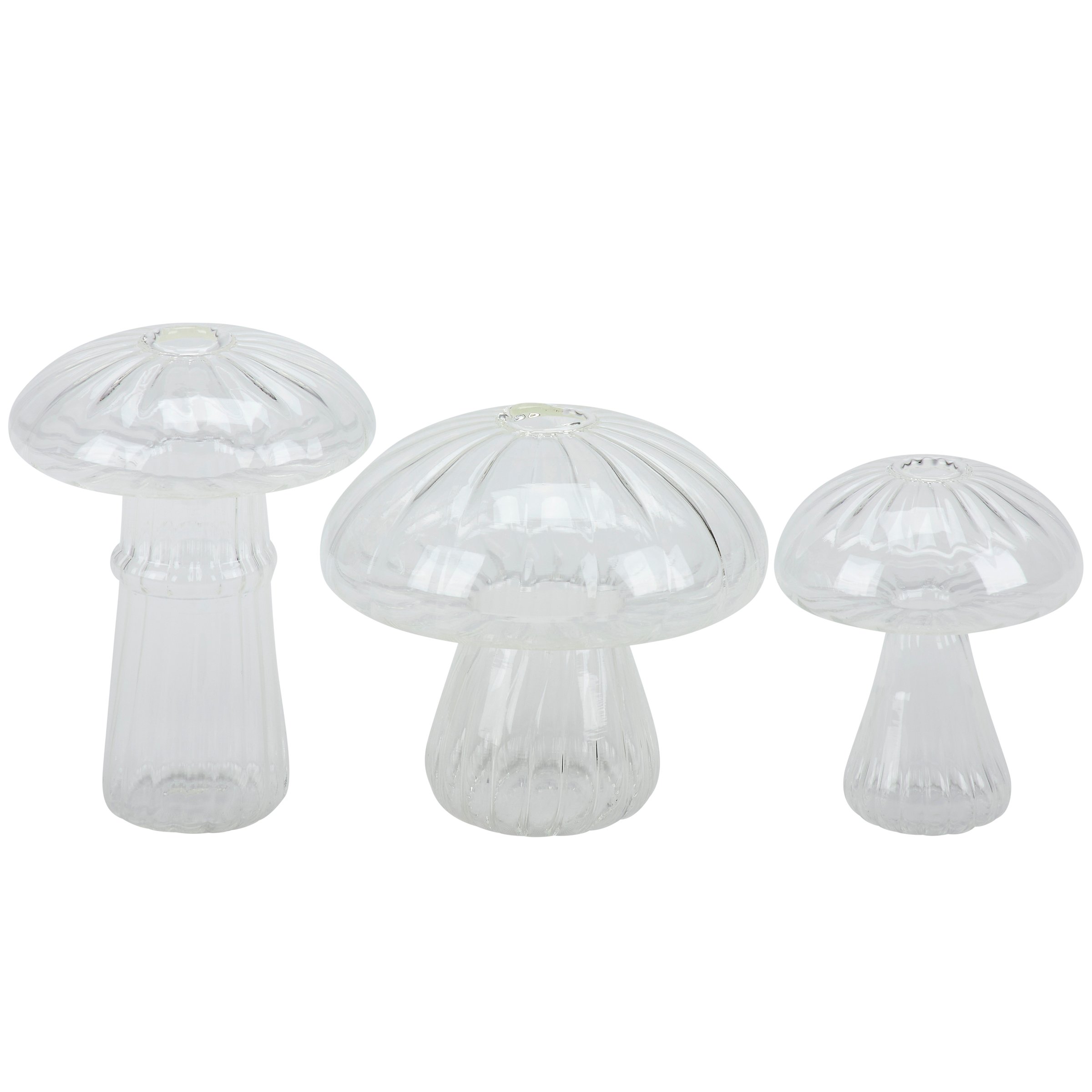 A set of 3 vases from our Cottagecore Collection displaying standing mushroom designs made from sculpted glass in different heights and shapes. Our Clear Mushroom vase set features openings on top of each to place stemmed florals. Greenery pictured not included. A set nature themed home accents with a variety of display options.
