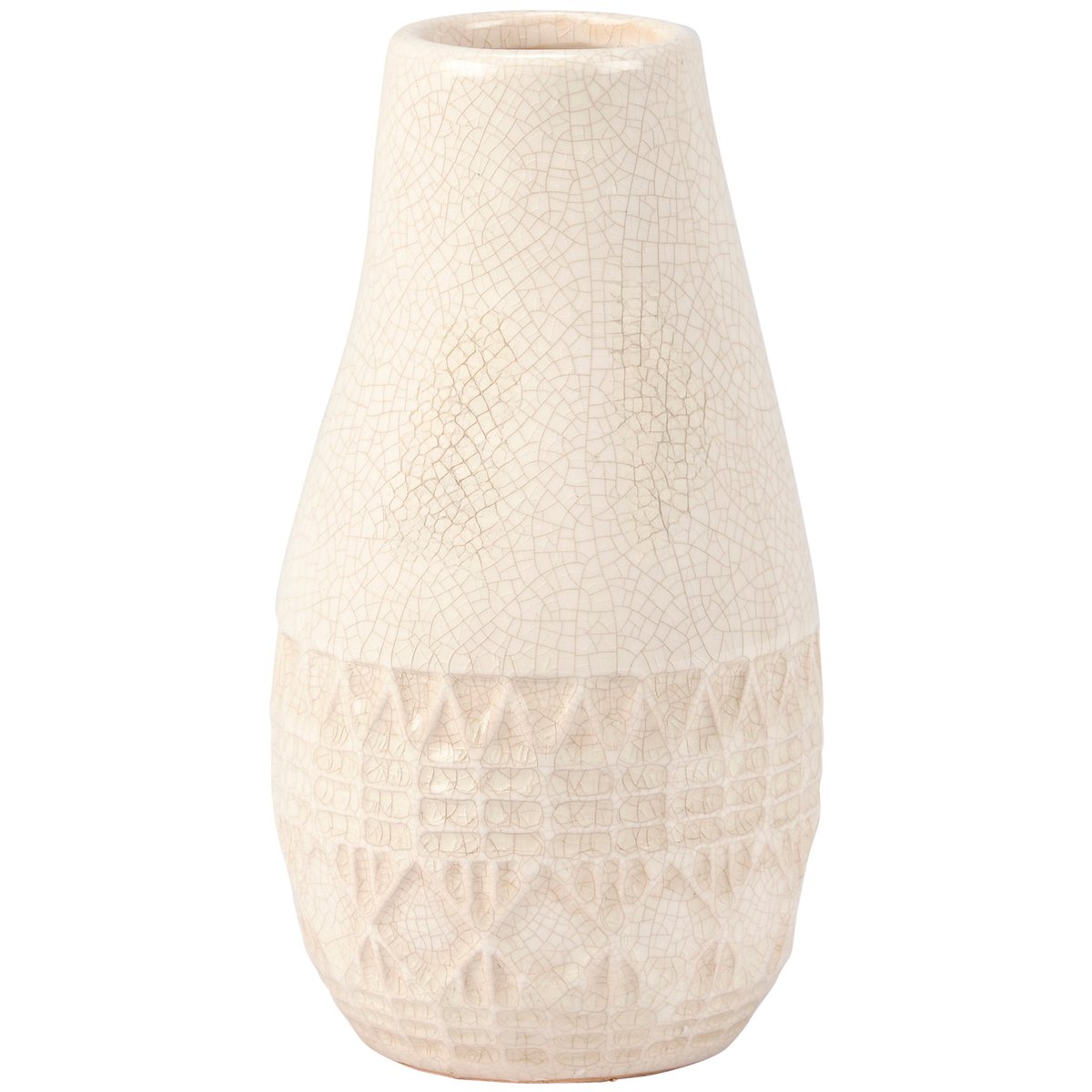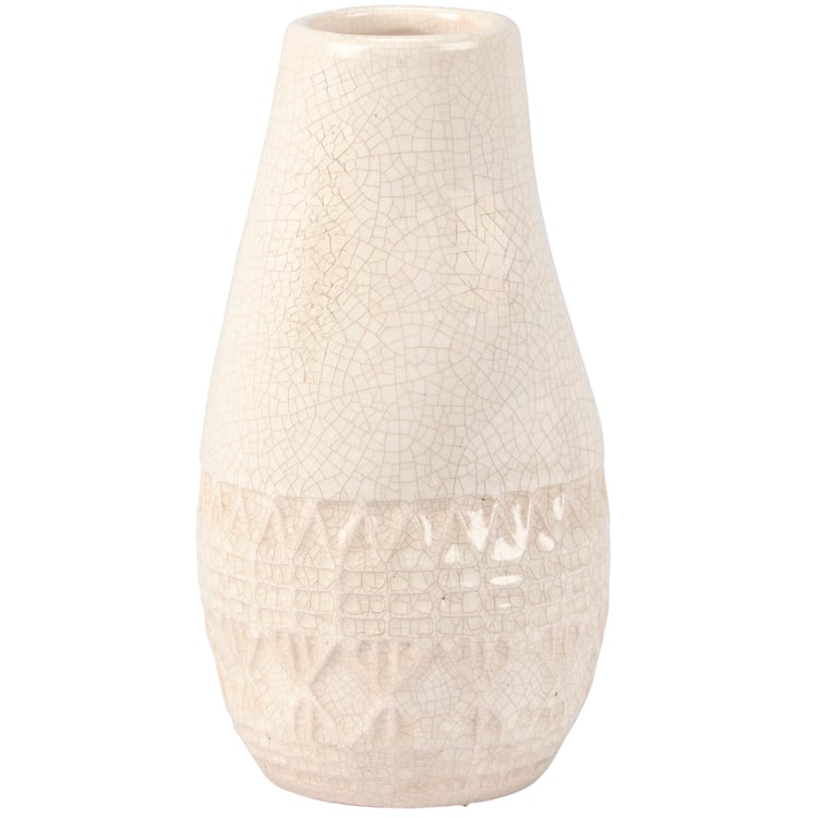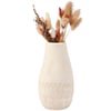 A stoneware vase from our Western Collection displaying a sculpted southwest inspired pattern and cream glaze finish with distressed details. Our Southwest vase features an opening on top to place greenery. Greenery pictured not included. A western-themed home accent with a variety of display options.