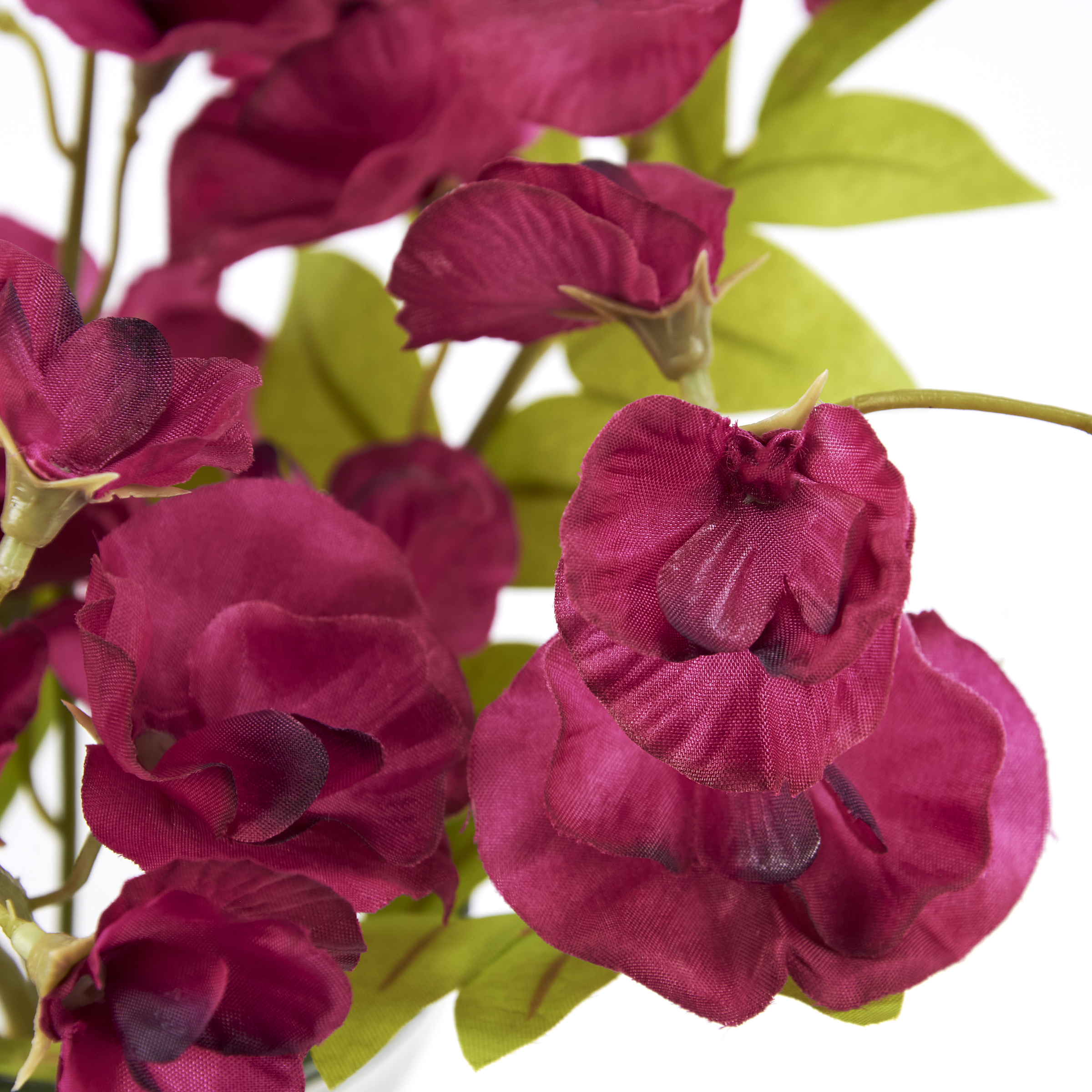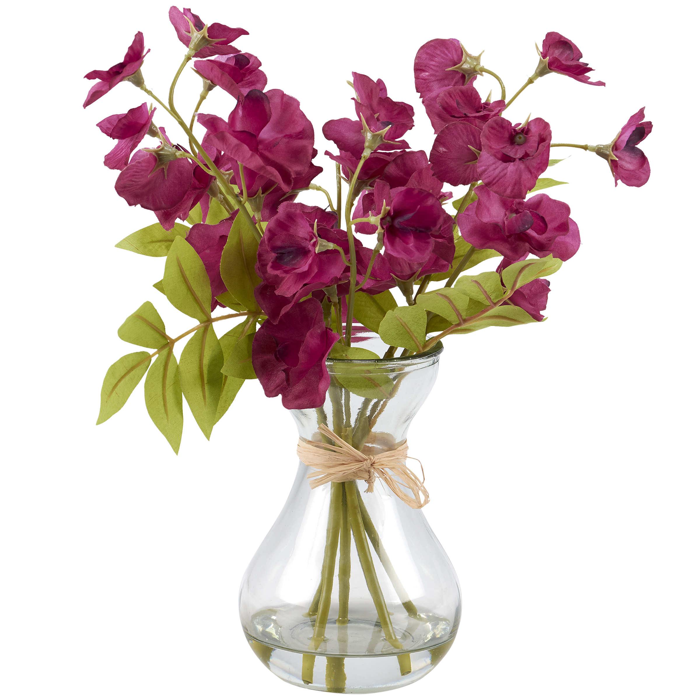 A small glass vase from our Botanical Collection featuring a delightful sweet pea bouquet. Faux plants bring botanical vibes to any space with zero maintenance. Vase bottom contains a silicone fill to resemble water. Our Sweet Pea vase complements well with coordinating pieces in collection for a charming display. Complete as shown. A floral-themed home accent perfect for easily adding natural style where real plants cannot thrive.
