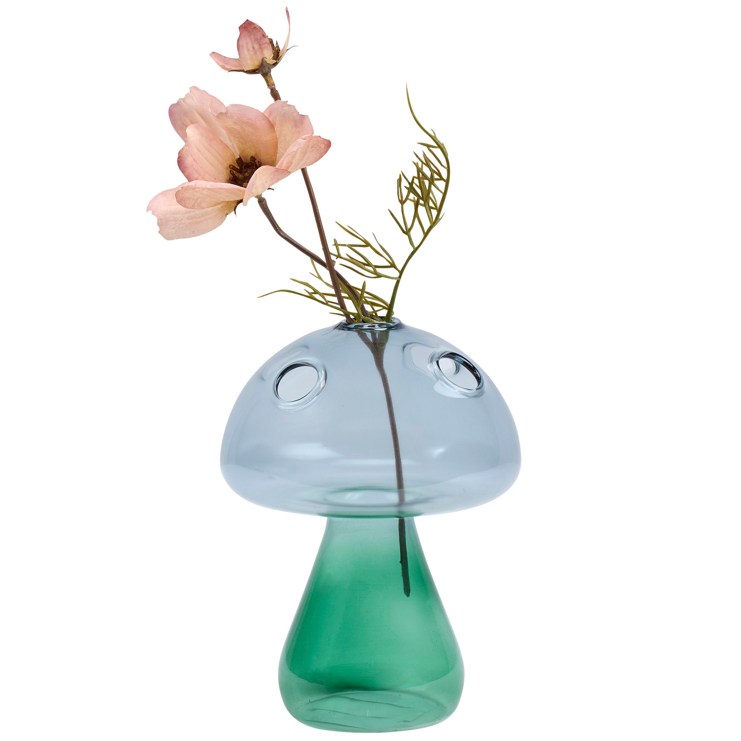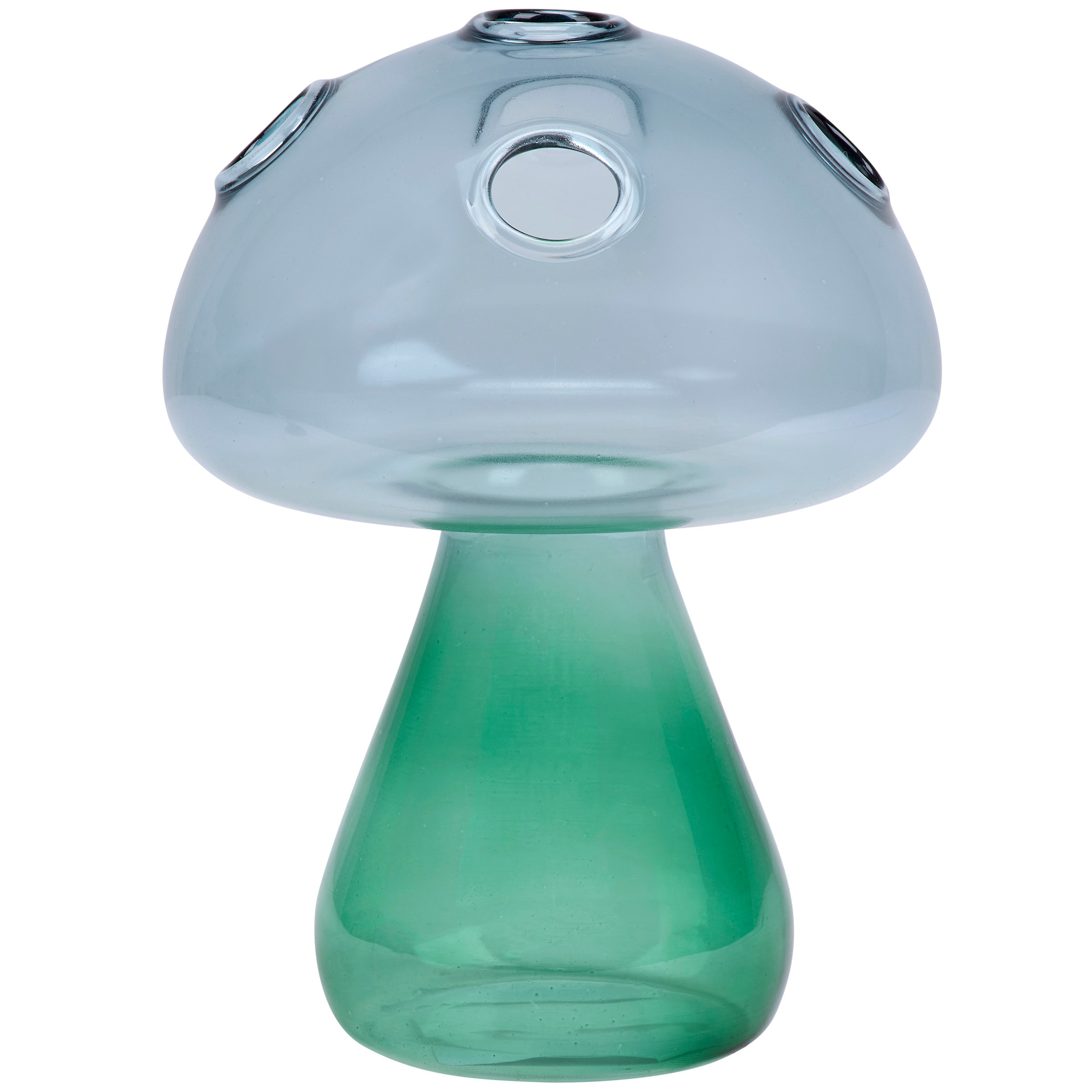 Add natural style to any space with this vase featuring a tall standing mushroom design made from sculpted glass in a gradient green color. Our Tall Green Mushroom vase features openings on top to place stemmed florals of choice to create a unique display. Greenery pictured not included. A stylish nature themed home accent with a variety of display options.