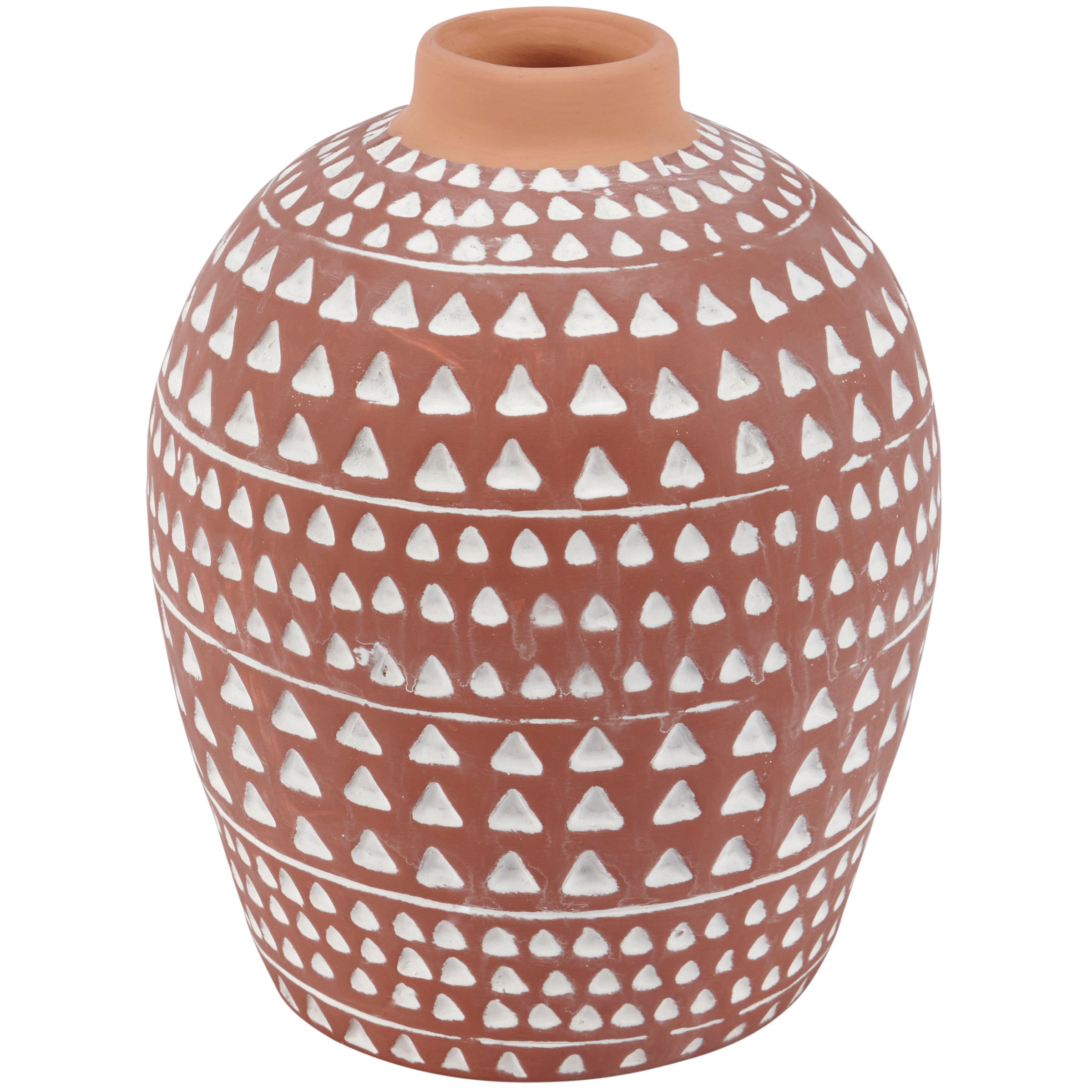 A ceramic vase from our Western Collection displaying a western inspired pattern with debossed details and sienna color palette. Vase features bare ceramic accents for a handmade appearance. Our Western Sienna vase features opening on top to place greenery. Greenery pictured not included. A western home accent with a variety of display options.