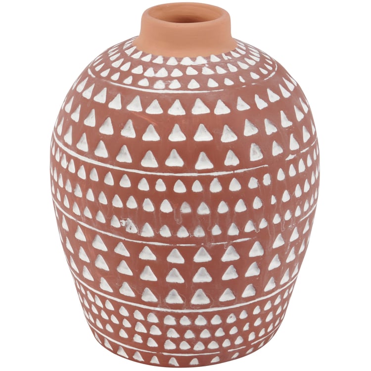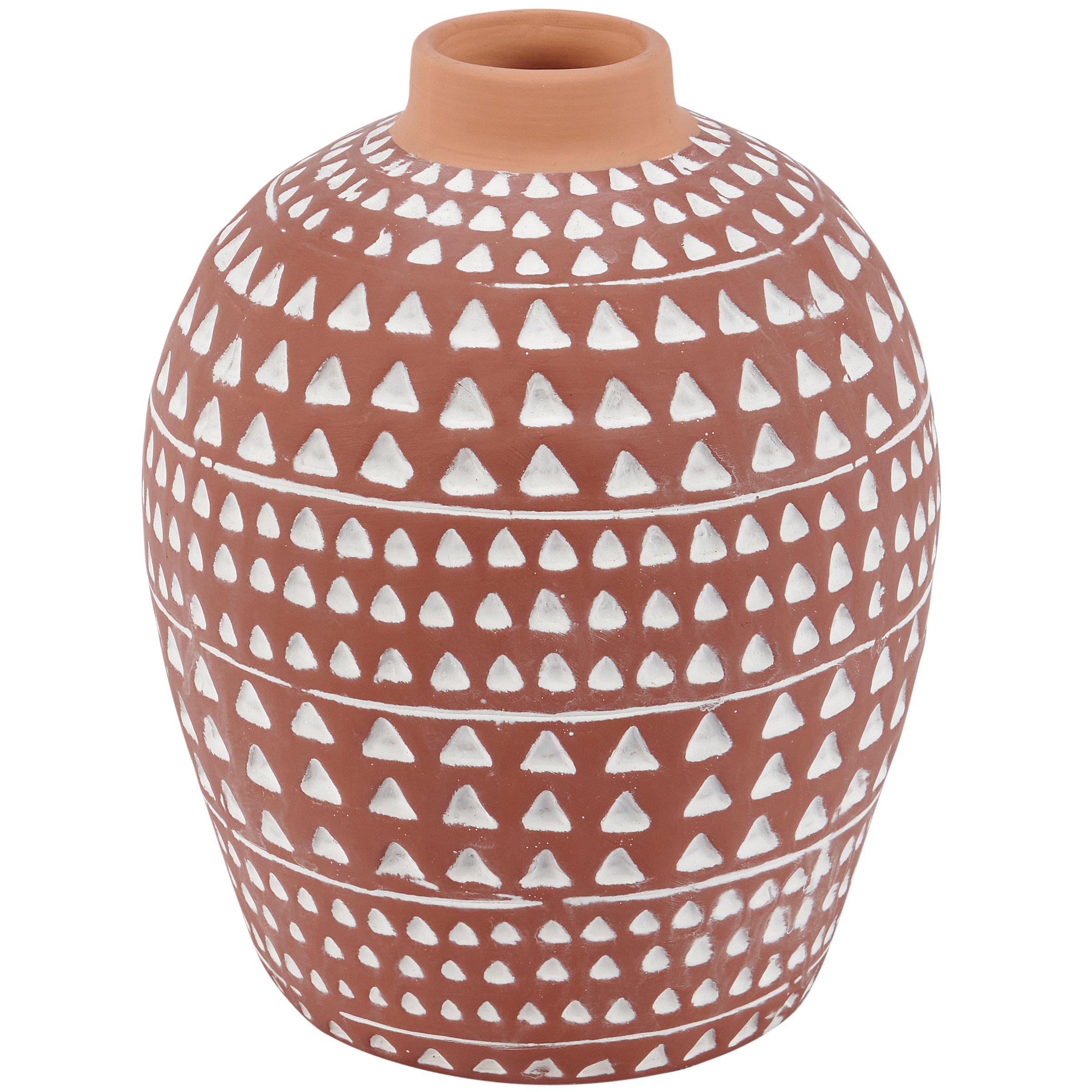 A ceramic vase from our Western Collection displaying a western inspired pattern with debossed details and sienna color palette. Vase features bare ceramic accents for a handmade appearance. Our Western Sienna vase features opening on top to place greenery. Greenery pictured not included. A western home accent with a variety of display options.