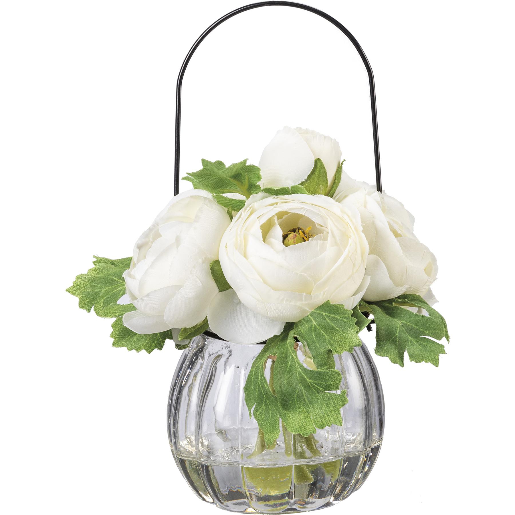A small glass vase featuring a white ranunculus bouquet. Contains a silicone bottom fill to resemble water. Complements well with coordinating pieces in collection for a charming indoor garden and includes a wire hanger.