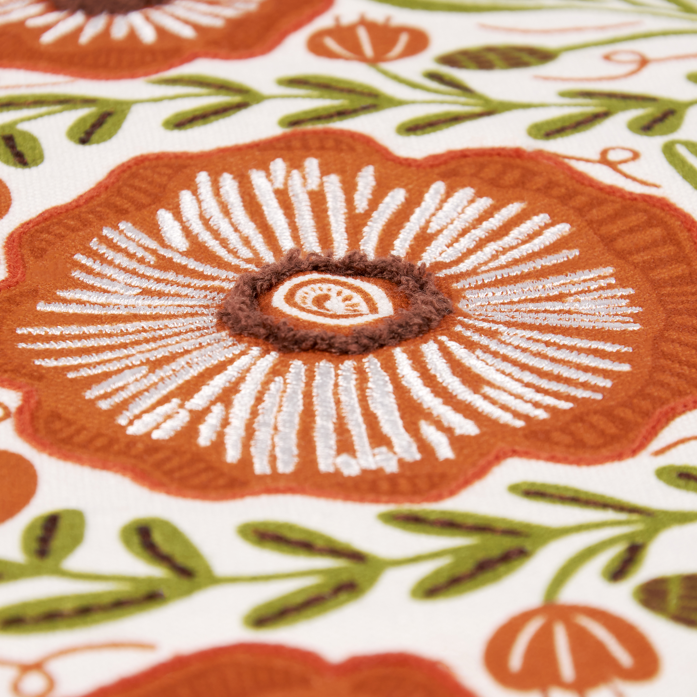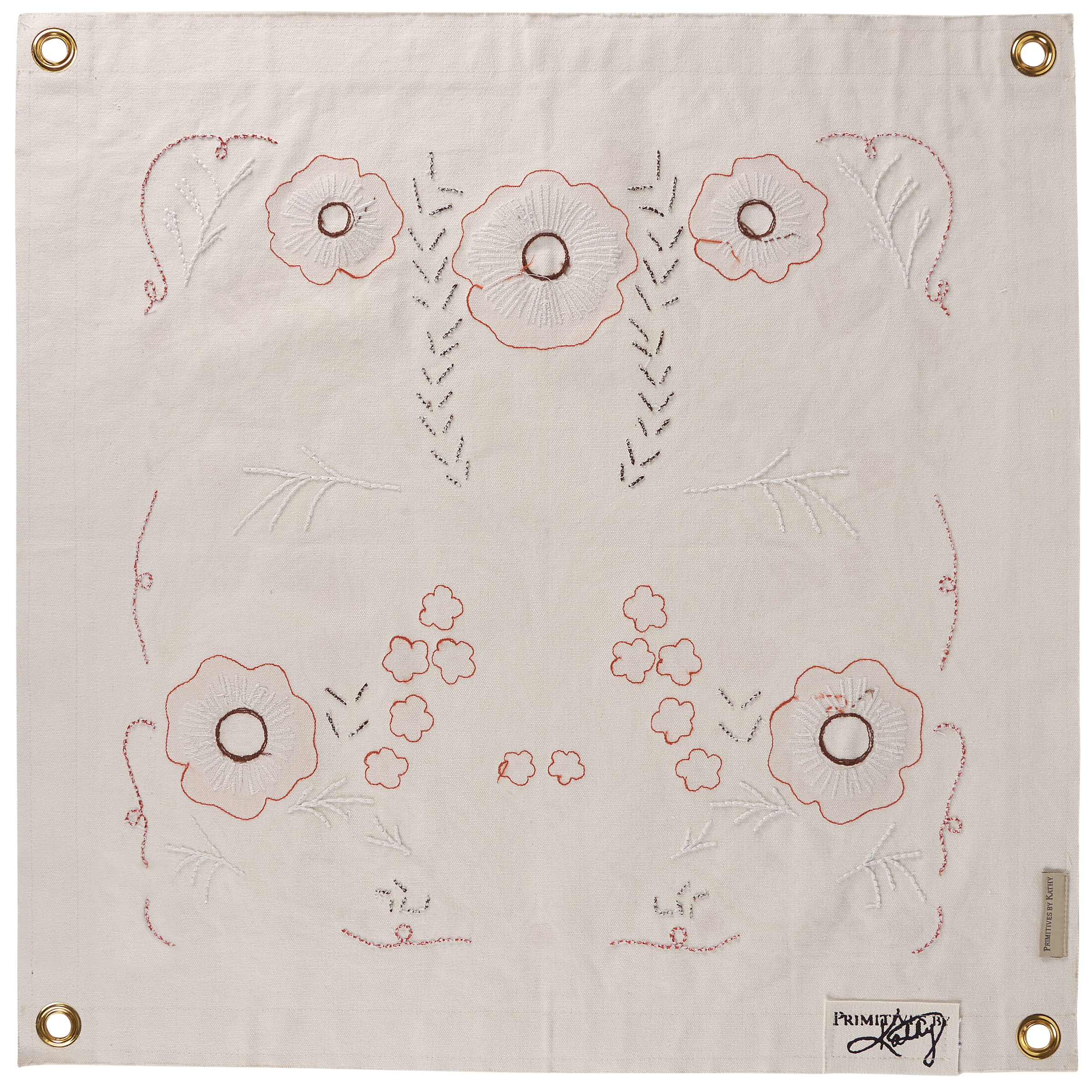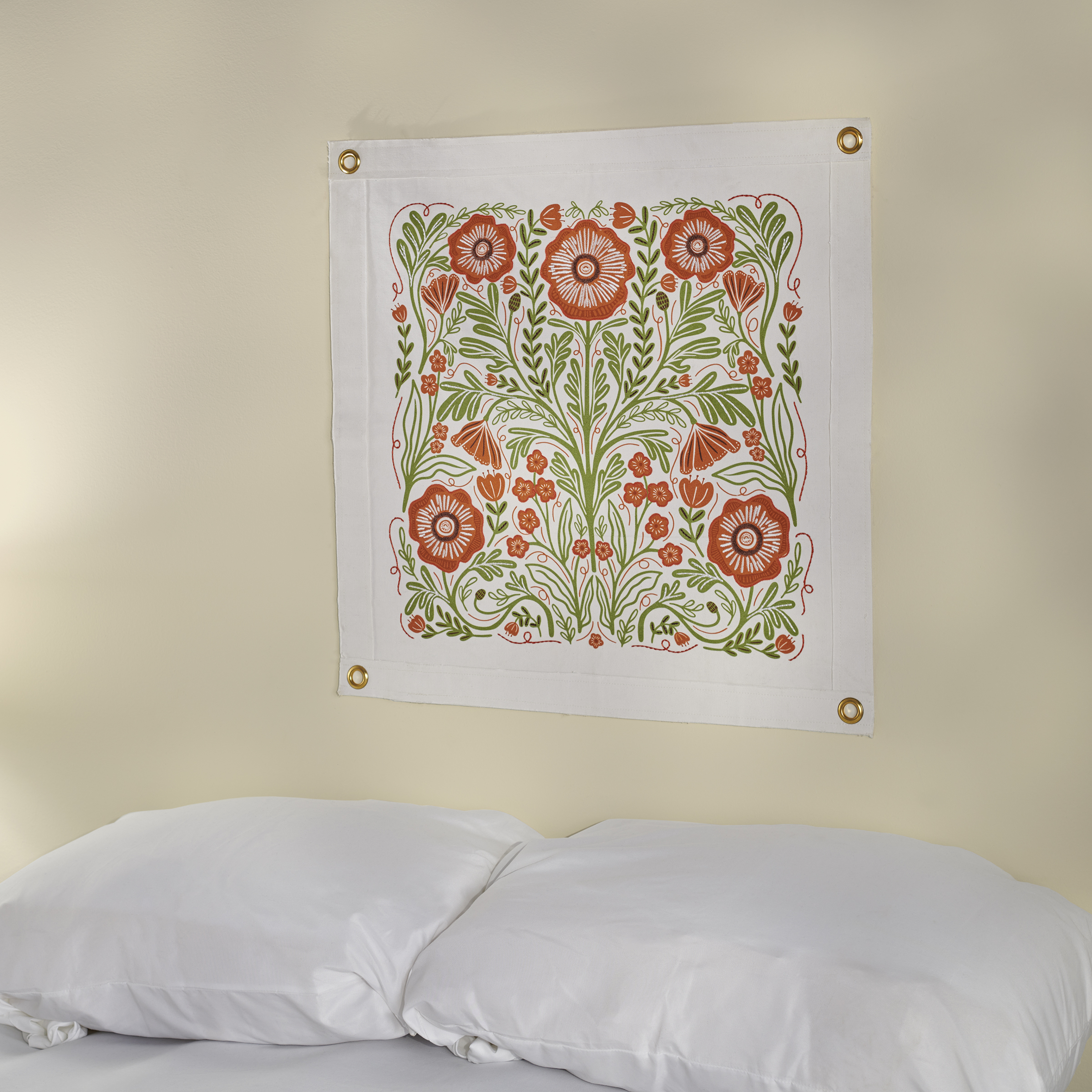 A canvas wall banner from our Folk Art Collection displaying hand illustrated designs of poppies inspired by folk art with embroidered accents for added texture. Wall banner features stitched border details and a large size for a nature-themed statement piece. Our Poppies Folk Art wall banner is easy to hang using the metal grommets on the corners. A rustic floral-themed home accent perfect for everyday display.