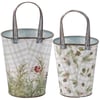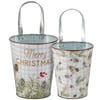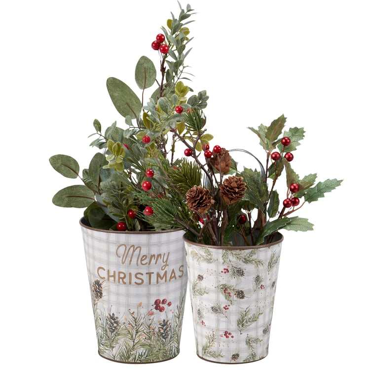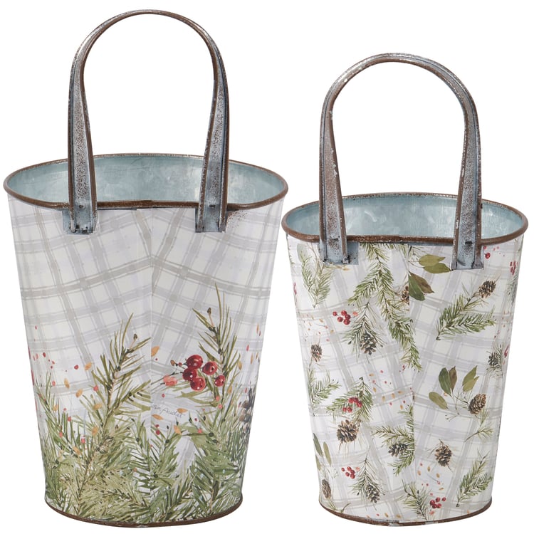 A set of metal wall buckets from our Christmas Collection featuring full wrap-around designs displaying Christmas greenery inspired patterns and a "Merry Christmas" sentiment on a gray plaid background. Christmas greenery designs are replicated from original art hand painted in a delicate watercolor style. Seasonal bucket set includes 2 buckets in different sizes that nest inside each other for compact storage. Our Christmas Greenery wall bucket set features a flat back and metal handle to easily hang against wall for display. Buckets can also free-stand on a flat surface. Greenery pictured not included. A set of rustic Christmas home accents perfect for seasonal displays.