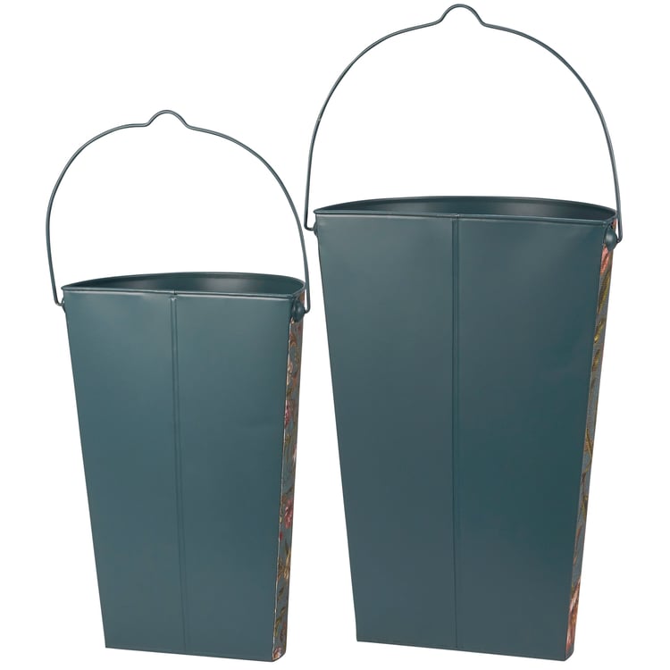 A set of metal wall buckets from our Art Nouveau Collection displaying art nouveau inspired designs of florals. Designs are replicated from original artwork painted onto burlap canvas, giving the art a unique depth and texture. Wall bucket set includes two buckets in different sizes that nest inside each other for convenient storage. Our Floral Nouveau wall bucket set features a flat back and metal handle with a small groove at the top for easy hanging. Buckets can also free-stand on a flat surface for display. Greenery pictured not included. A set of vintage home accents with a variety of display options.