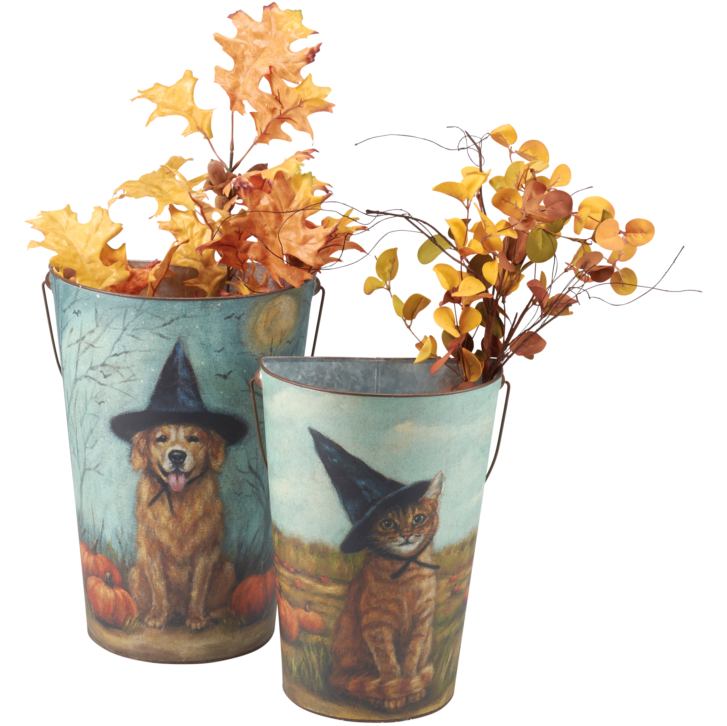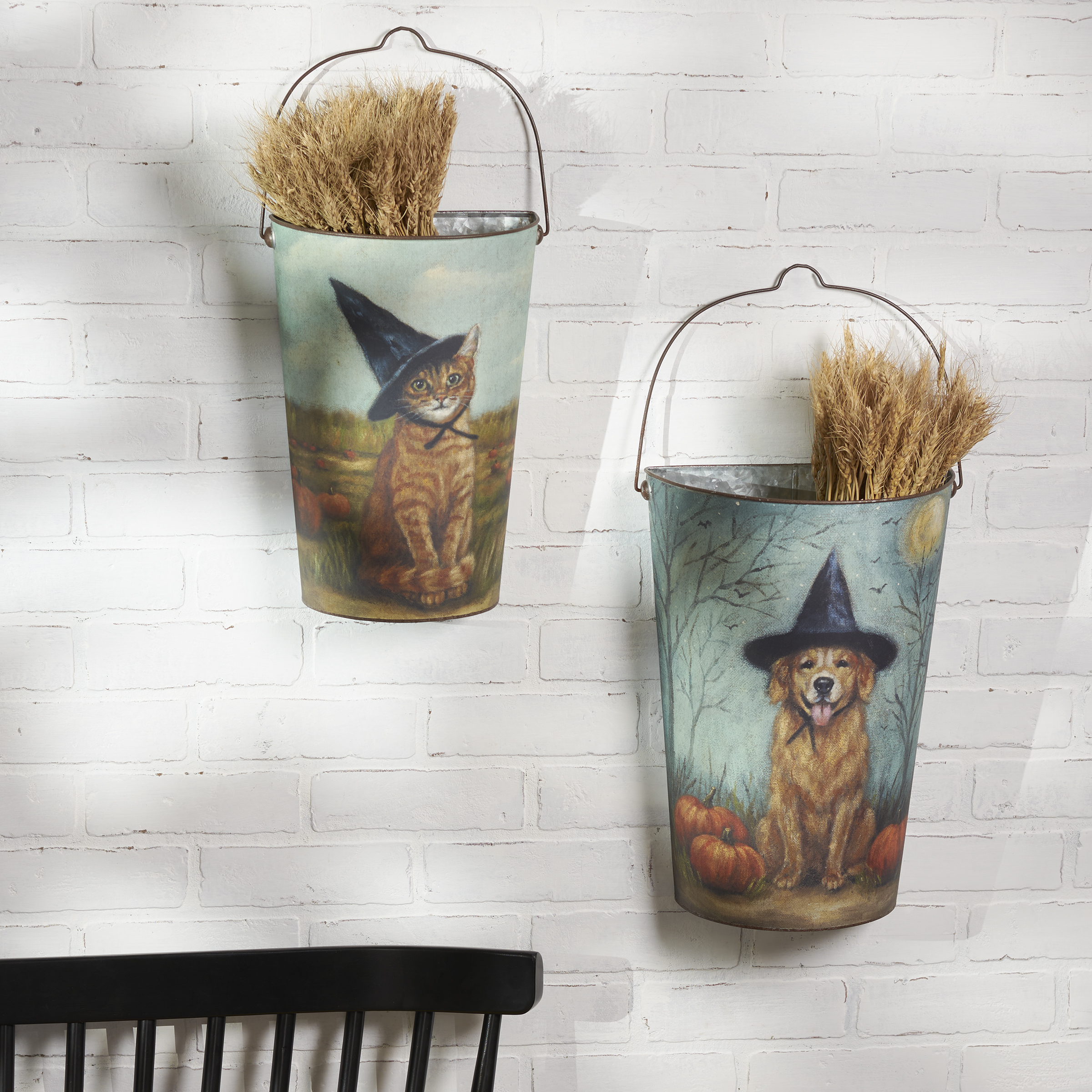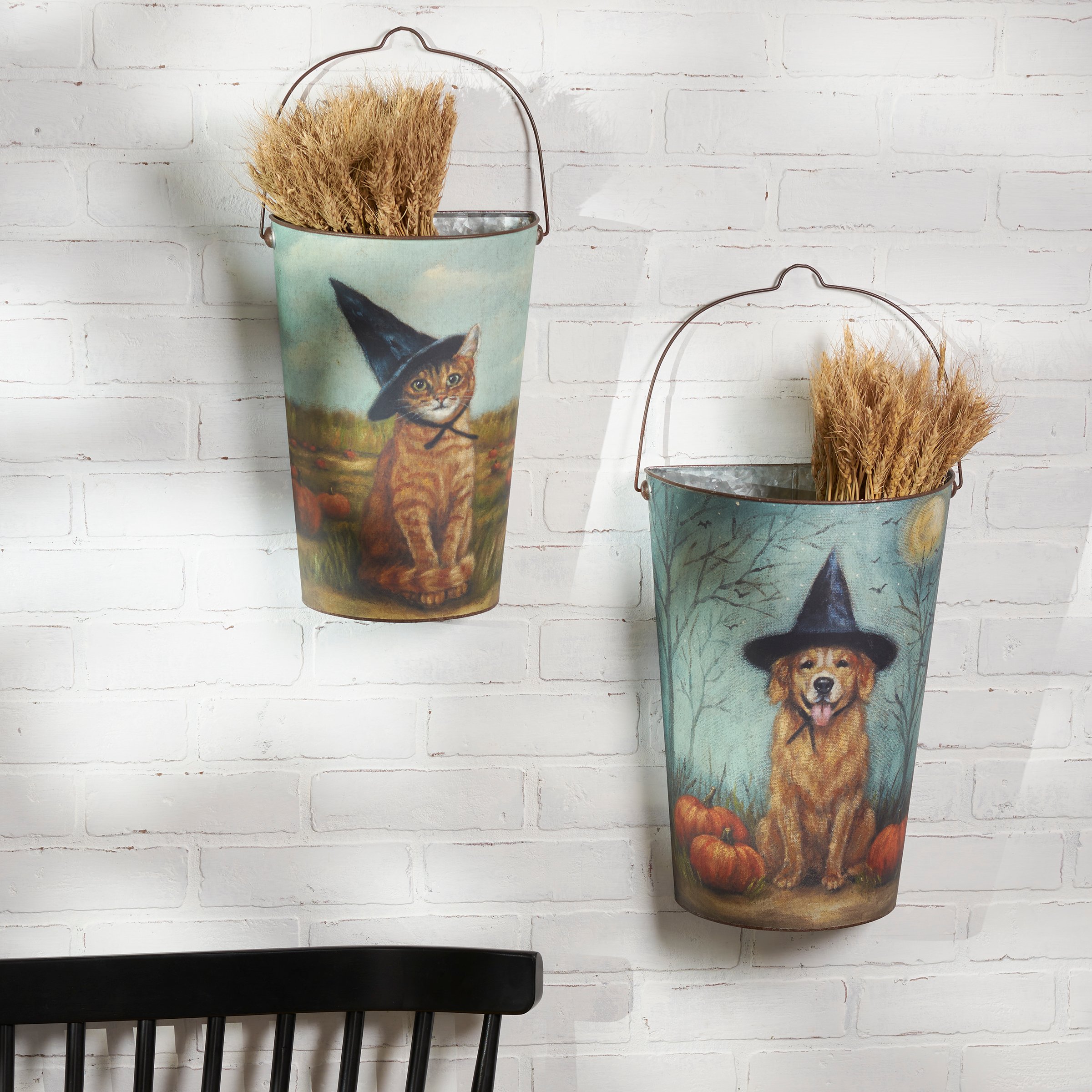 A set of metal wall buckets from our Halloween Collection displaying charming hand painted designs of animals wearing witch hats on each with a dog on one and cat on the other. Designs are replicated from original artwork painted onto burlap canvas, giving the art a unique depth and texture. Set includes two buckets in different sizes that nest inside each other for convenient storage. Our Spooky Friends wall bucket set features a flat back and metal handle with a small groove at the top for easy hanging. Buckets can also free-stand on a flat surface. Greenery pictured not included. A rustic home accent perfect for seasonal displays.