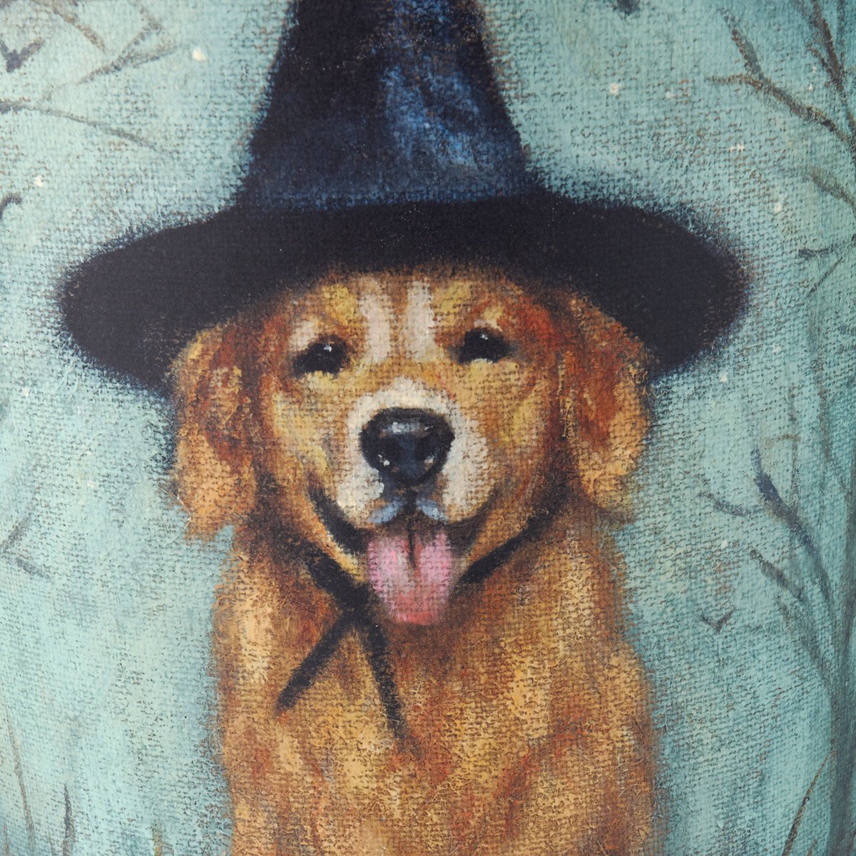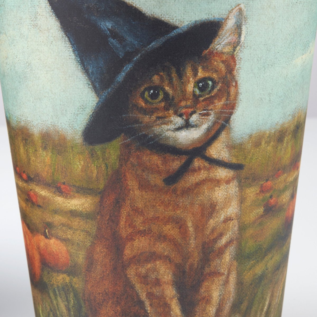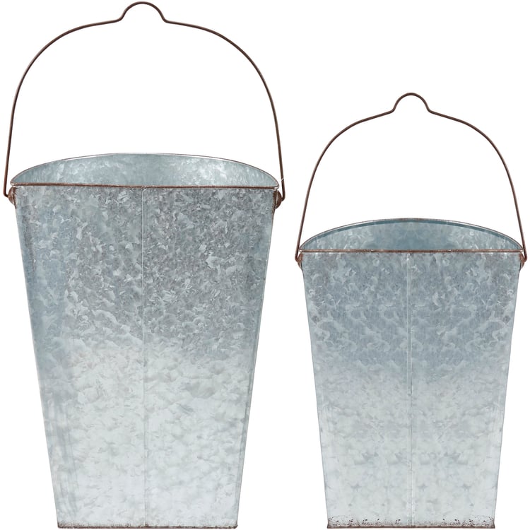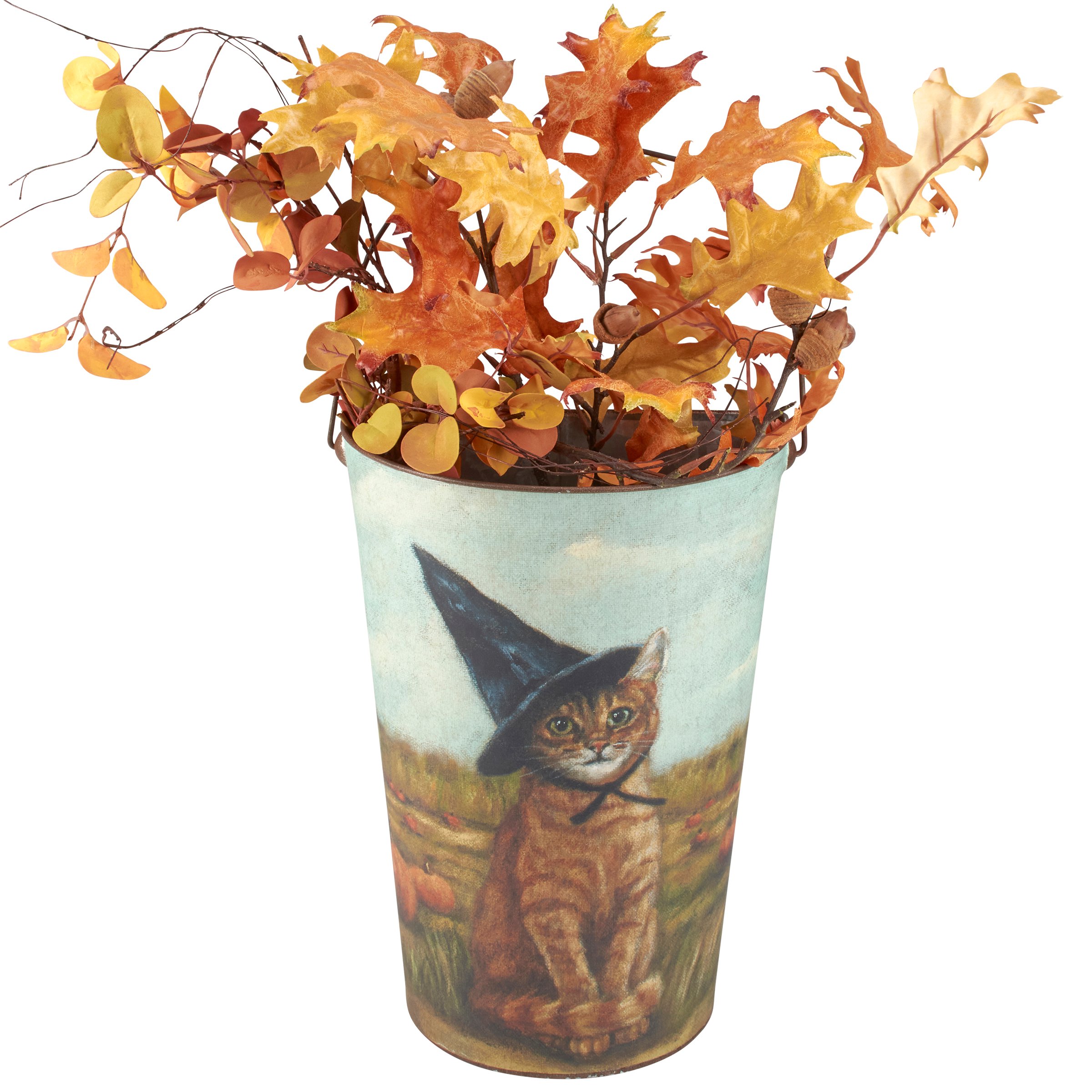 A set of metal wall buckets from our Halloween Collection displaying charming hand painted designs of animals wearing witch hats on each with a dog on one and cat on the other. Designs are replicated from original artwork painted onto burlap canvas, giving the art a unique depth and texture. Set includes two buckets in different sizes that nest inside each other for convenient storage. Our Spooky Friends wall bucket set features a flat back and metal handle with a small groove at the top for easy hanging. Buckets can also free-stand on a flat surface. Greenery pictured not included. A rustic home accent perfect for seasonal displays.