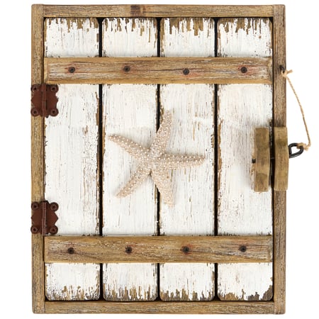 A rustic wall cabinet from our Beach Collection displaying a beach wood inspired design with aged metal hardware and distressed details as well as a decorative starfish attached to the cabinet door. Wall cabinet features a hanging metal latch that opens to reveal hooks inside to hang keys, beach passes, and more. Our Starfish wall cabinet is easy to hang via the attached sawtooth hanger on the back. A rustic beach-themed home accent that coordinates well with primitive home decor.