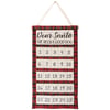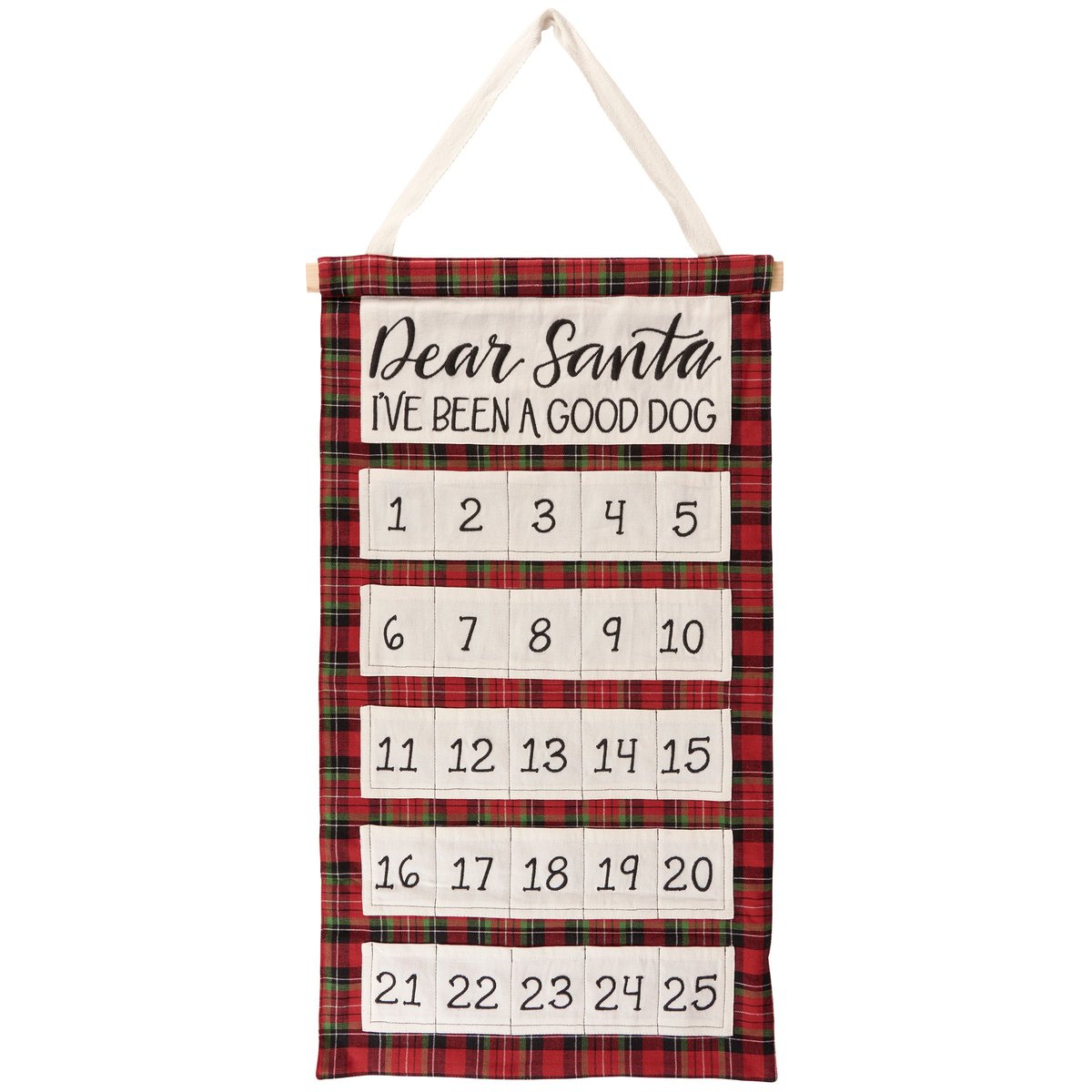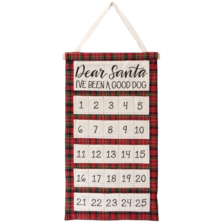 A cotton wall countdown from our Holiday Pet Collection displaying a holiday red plaid with a fun pet inspired seasonal sentiment that reads "Dear Santa, I've Been A Good Dog." Our A Good Dog wall countdown features 25 numbered pockets perfect for placing treats or ornaments to display the days left until Christmas. Christmas countdown is easy to display via the cotton tape hanger attached to the top. A fun pet-themed home accent perfect for counting down the days to Christmas.