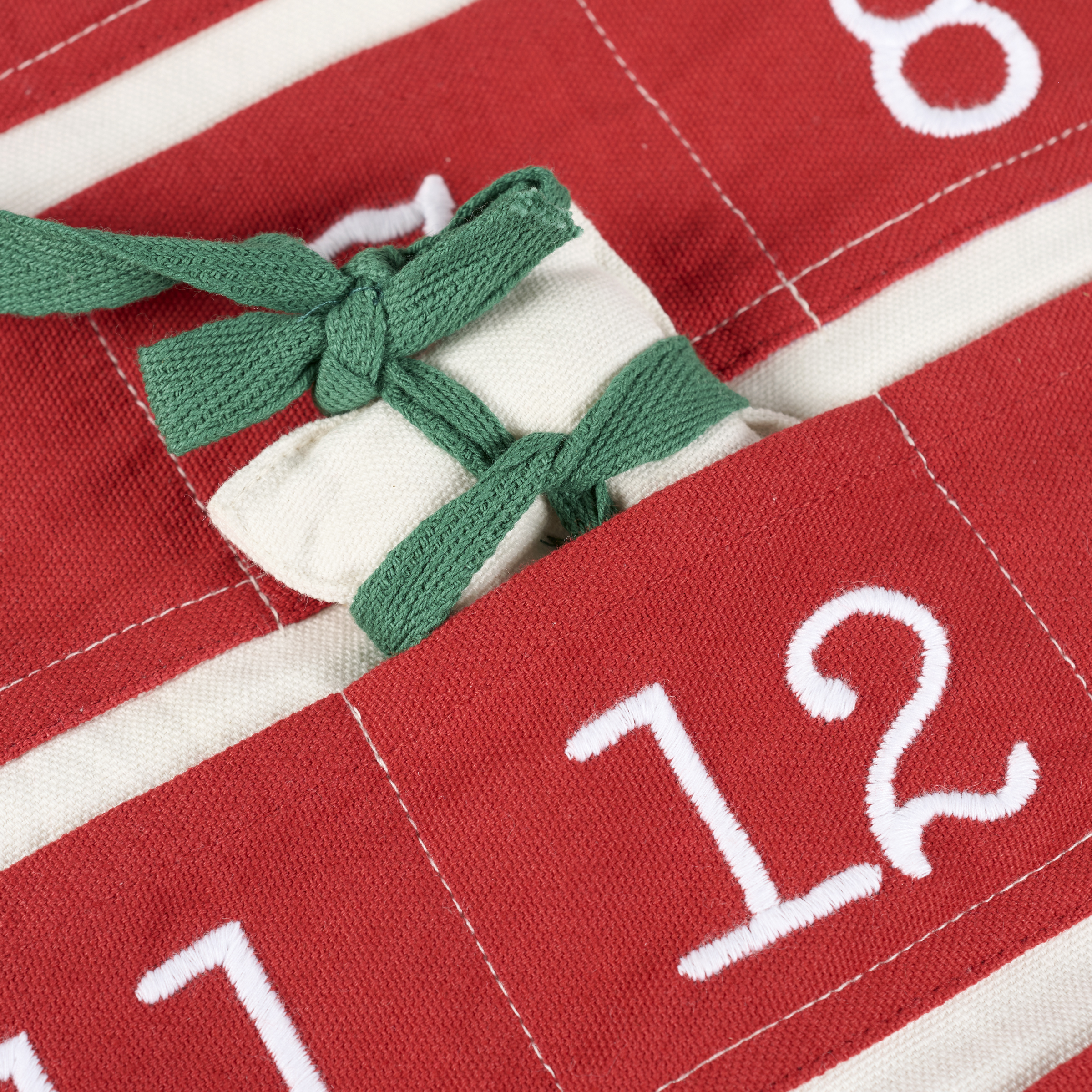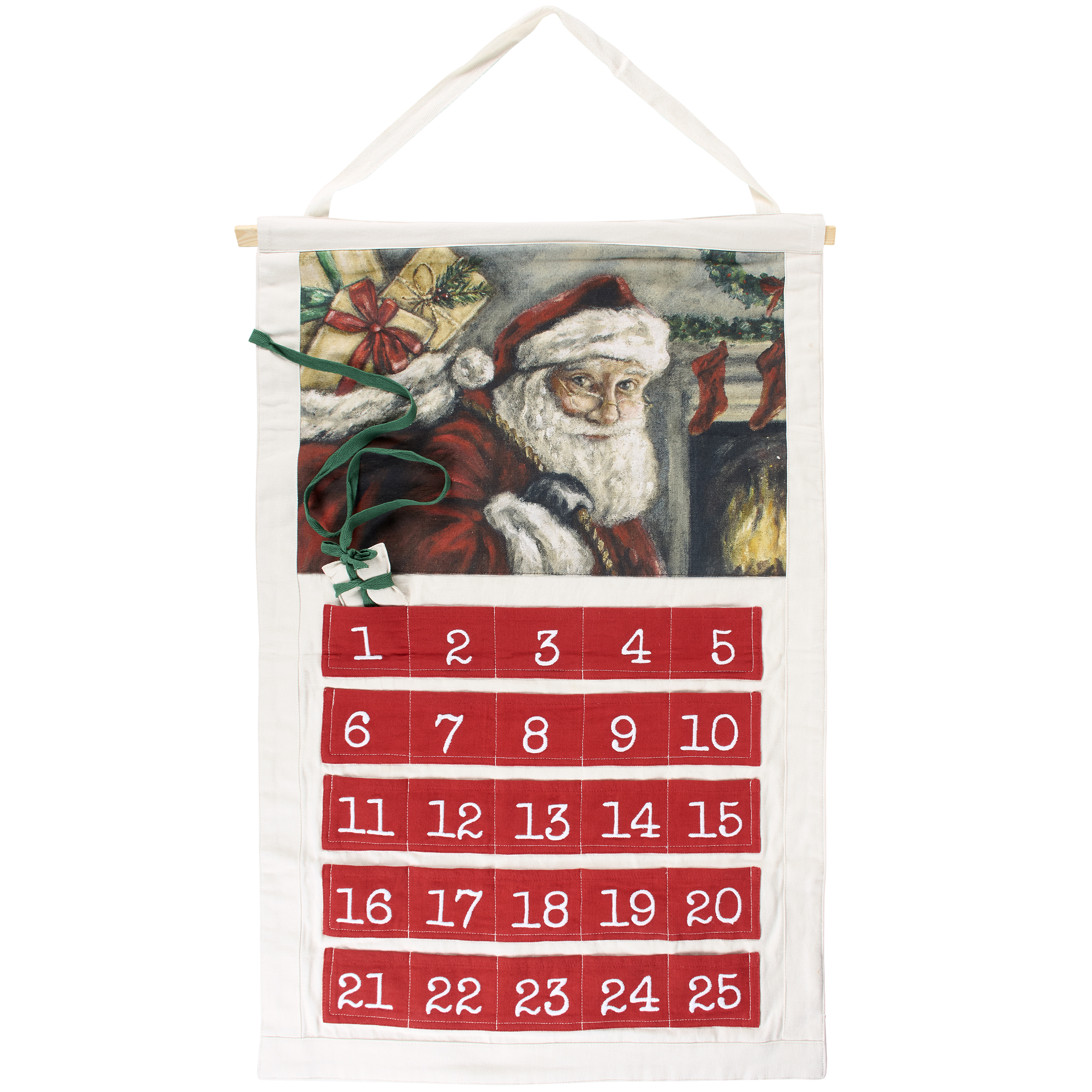 A canvas wall countdown from our Christmas Collection displaying a charming scene of Santa delivering presents on Christmas eve. Santa design is replicated from original artwork painted onto burlap canvas, giving the art a unique depth and texture. Our Christmas Eve Santa wall countdown features 25 numbered pockets and a cotton ornament attached to display the days left until Christmas. Christmas countdown is easy to display via the cotton tape hanger attached to the top. A rustic home accent perfect for counting down the days to Christmas.