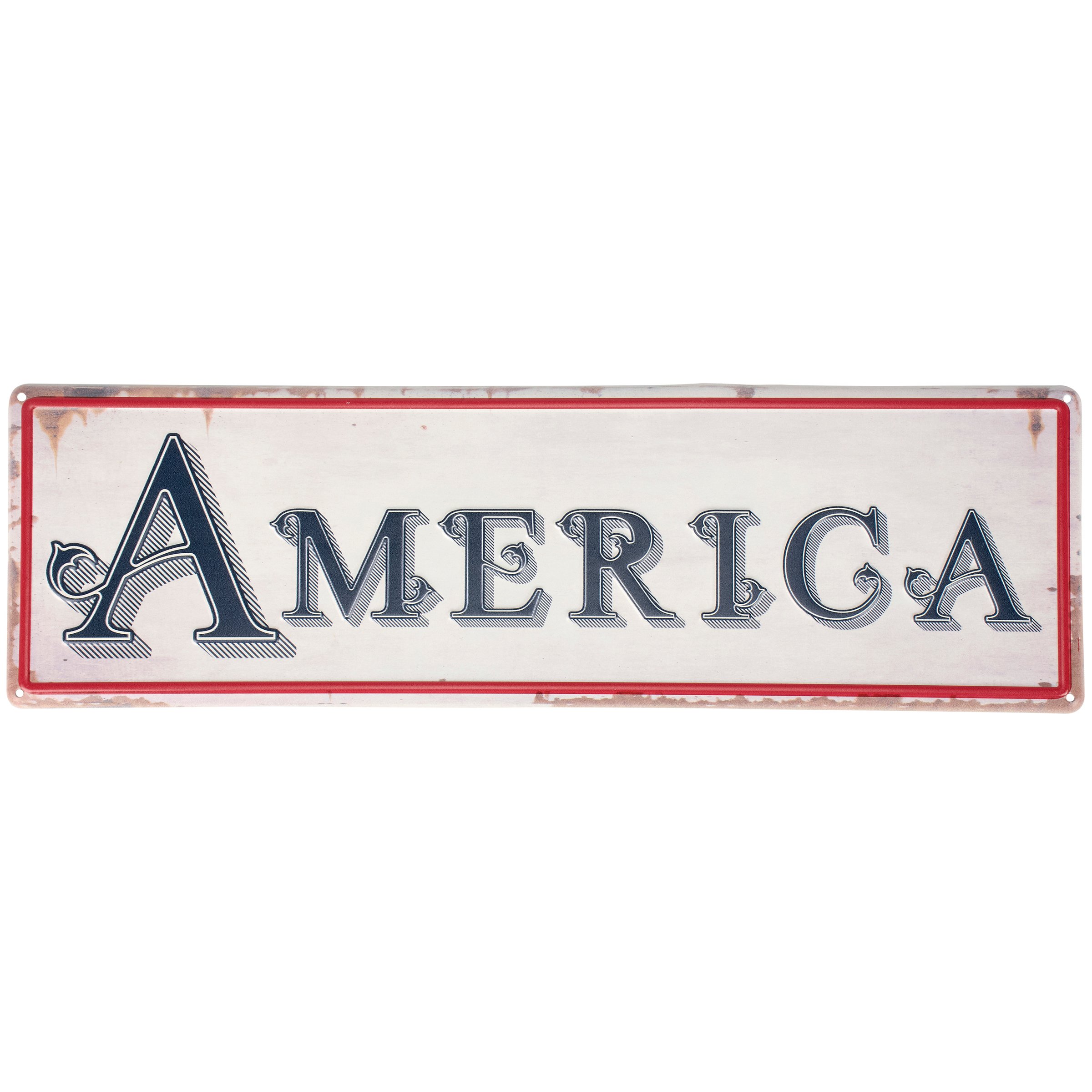 A metal wall décor piece from our Patriotic Collection featuring a rustic sign design displaying an "America" sentiment in a vintage Americana style. Americana sign design features embossed details and rusting accents for an aged appearance. Our America metal wall décor is easy to hang against wall using the included mounting hardware and pre-drilled holes in each corner. A vintage patriotic home accent perfect for 4th of July and Memorial Day decorating or celebrating stars and stripes all year round.