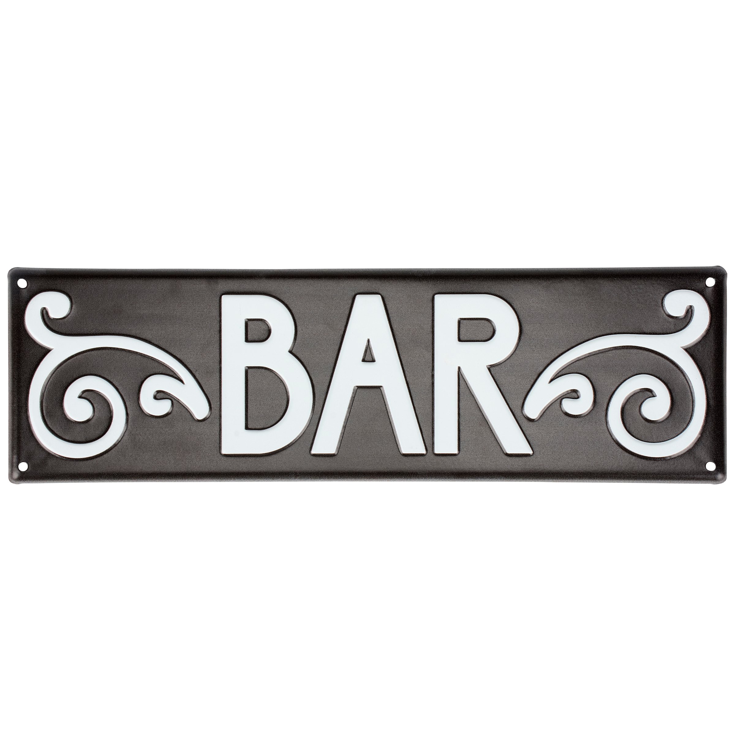 A metal wall décor piece from our Art Deco Collection featuring an elegant black and white bar sign design displaying a bold "Bar" sentiment and graphic accents. Bar sign features embossed details for added dimension. Our Bar metal wall décor is easy to hang against wall using the included mounting hardware and pre-drilled holes in each corner. A vintage alcohol themed home accent perfect for a home bar.