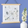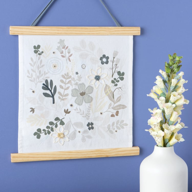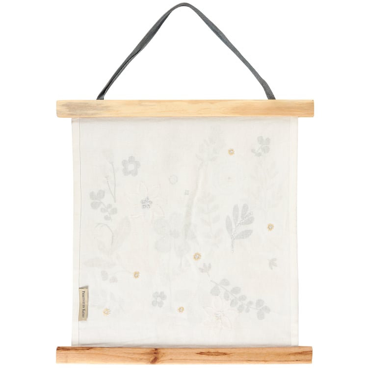 A wall décor piece from our Botanical Collection displaying beige floral designs with embroidered accents on canvas stretched between two wooden borders. Our Beige Florals wall décor is easy to hang for display via attached cotton tape hanger. A rustic floral-themed home accent perfect for everyday display.
