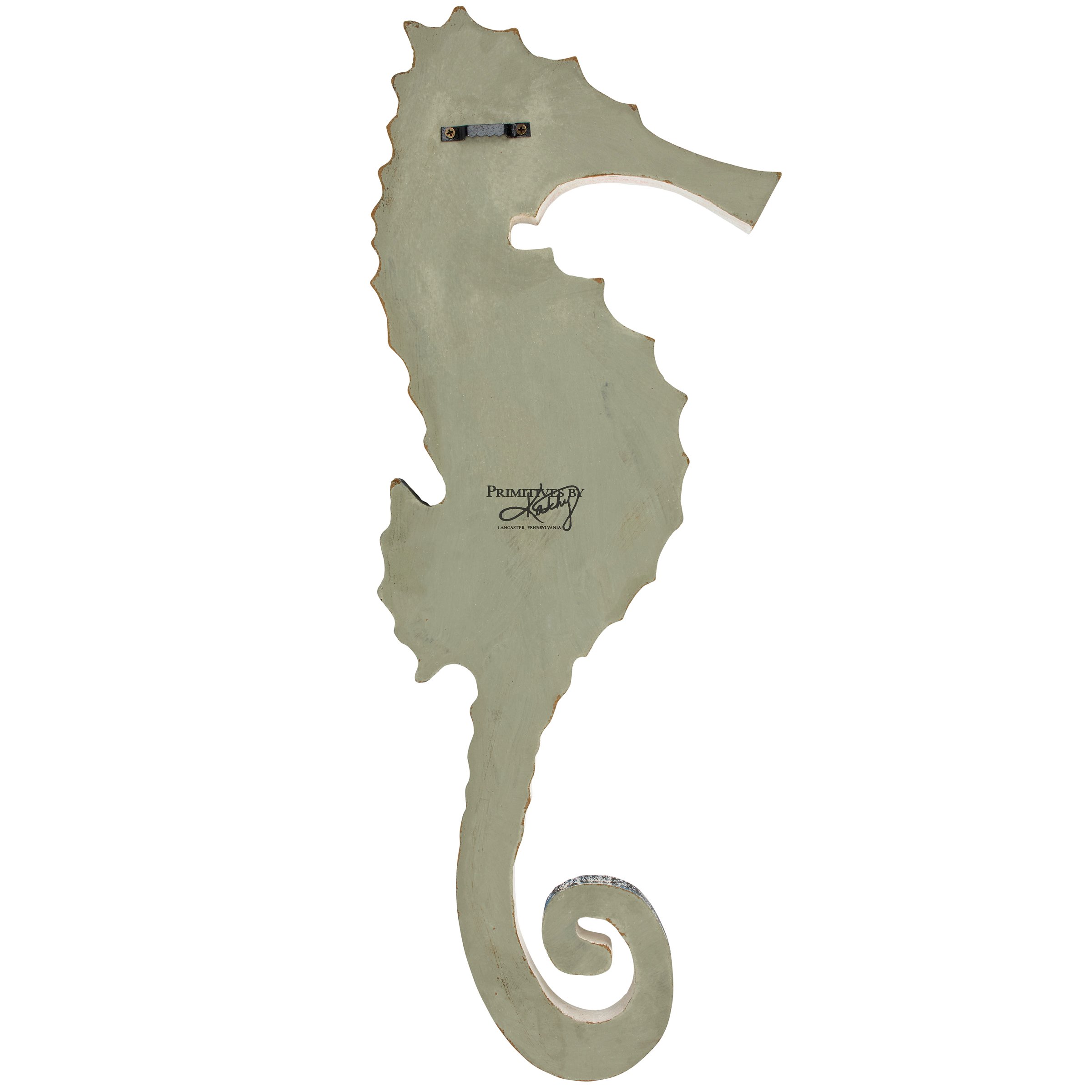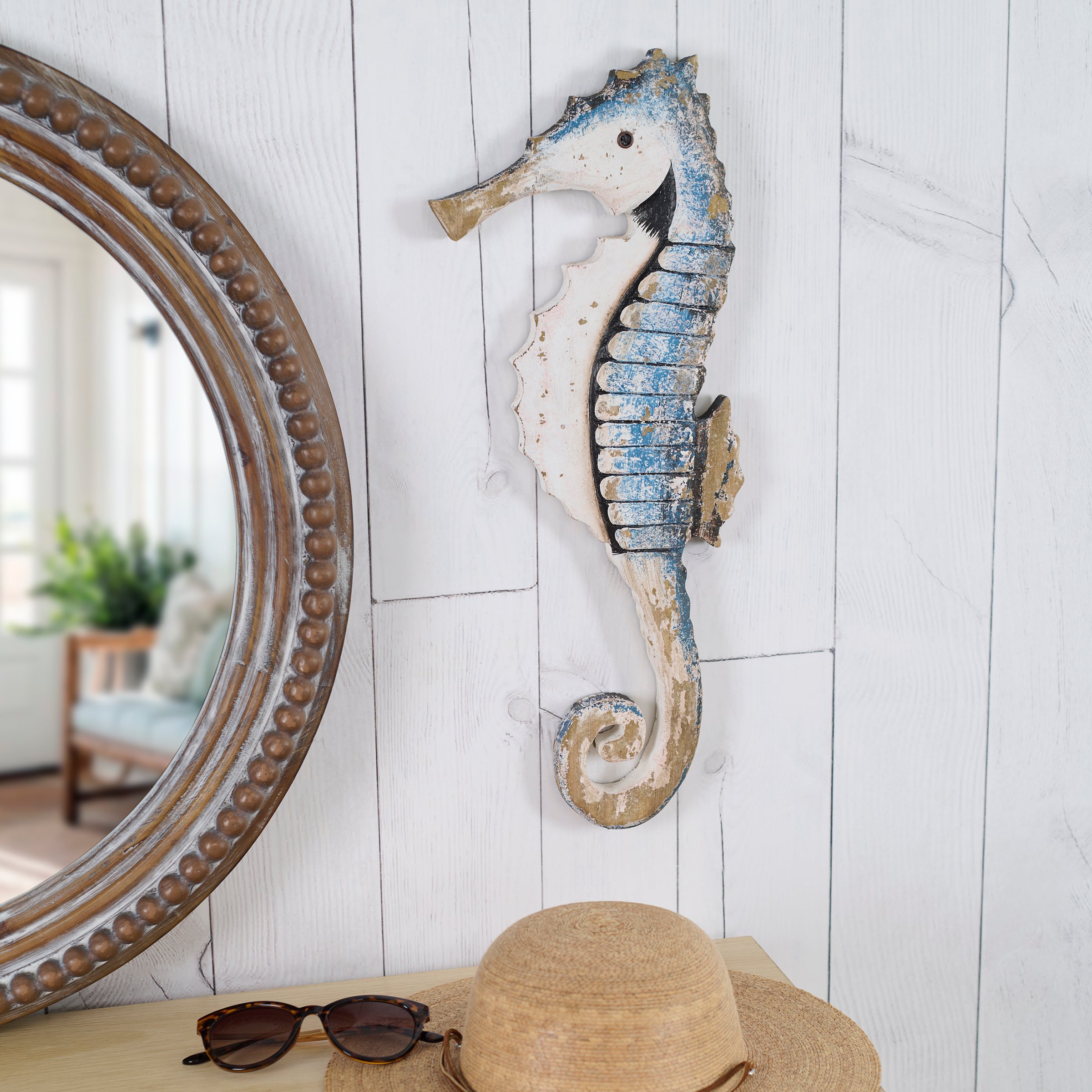 A wall decor piece from our Beach Collection featuring a rustic inspired blue seahorse design made of natural wood with painted accents and distressed details. Decorative seahorse features aged metal accents and a flat back to easily hang against a wall. Our Blue Seahorse wall decor hangs for display via the sawtooth hanger attached to the back. A rustic beach themed home accent that coordinates well with primitive home décor.