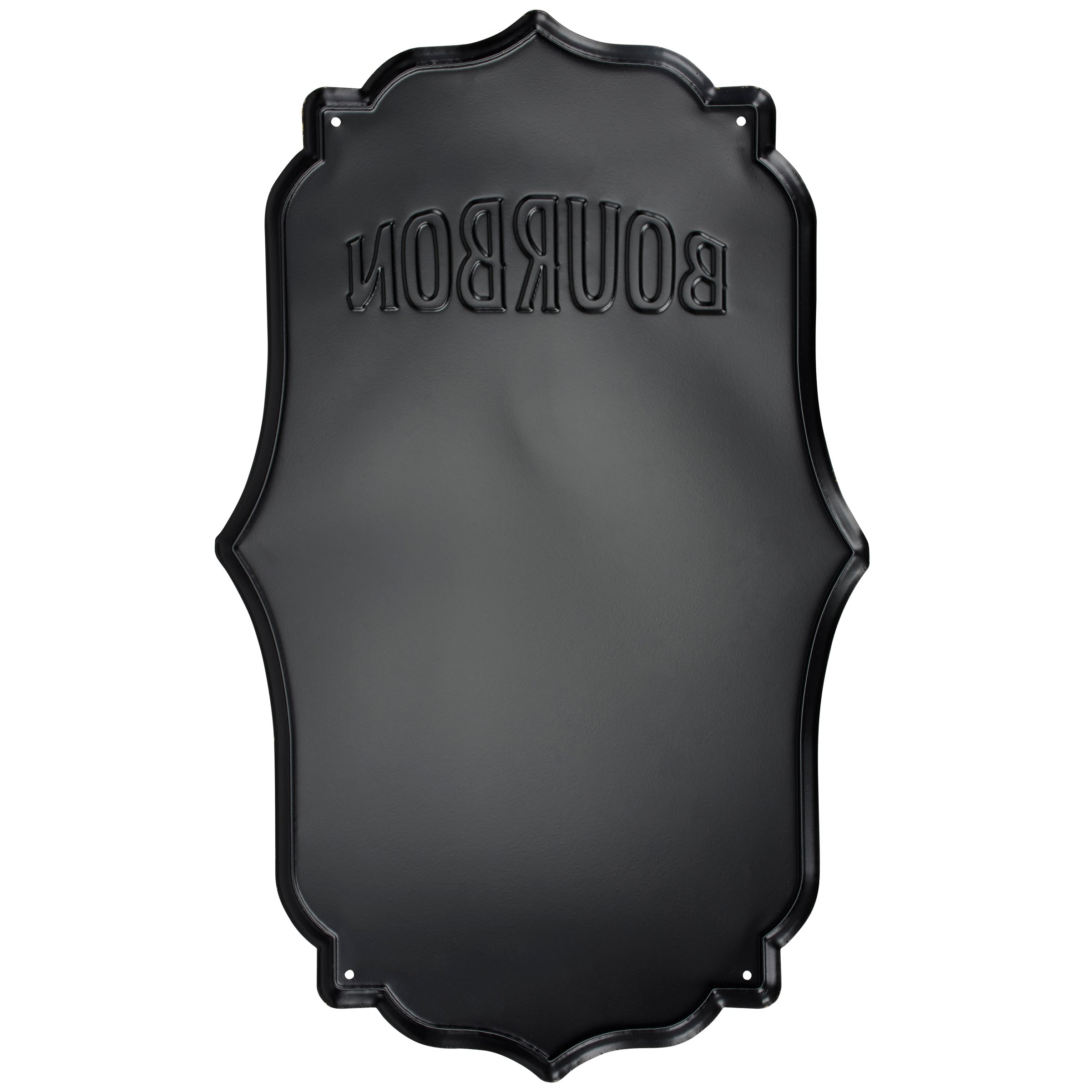 A metal wall décor piece from our Art Deco Collection displaying an art deco inspired design resembling a drink menu listing various types of bourbon with descriptions for each. Bourbon sign features embossed details and metallic gold accents. Our Bourbon metal wall décor is easy to hang against wall using the included mounting hardware and pre-drilled holes at the top and bottom. A vintage alcohol themed home accent perfect for a home bar.