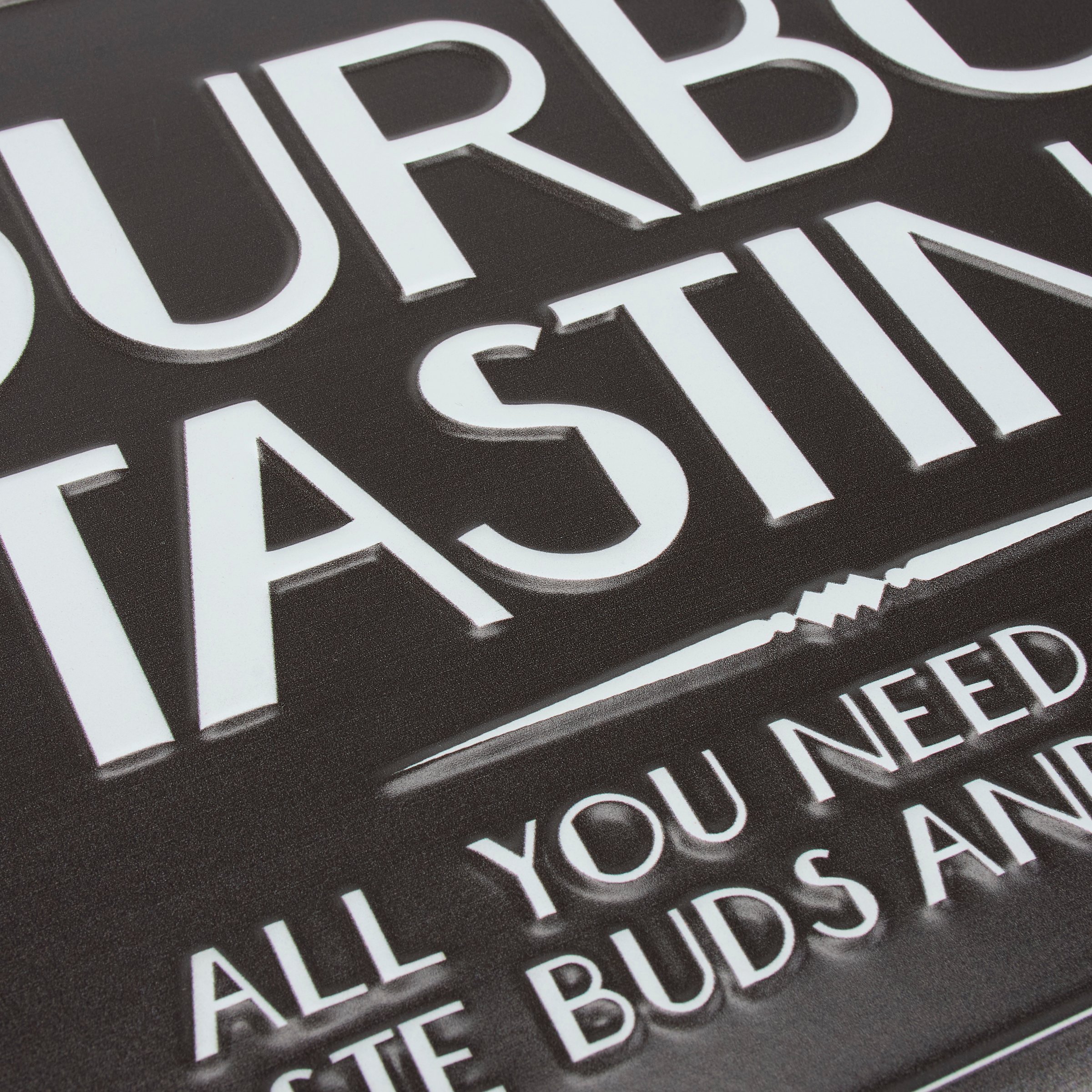 A metal wall décor piece from our Art Deco Collection featuring an elegant black and white bar sign design displaying a bold alcohol themed sentiment that reads "Bourbon Tasting - All You Need Is Your Taste Buds And Curiosity." Bar sign features embossed details for added dimension. Our Bourbon Tasting metal wall décor is easy to hang against wall using the included mounting hardware and pre-drilled holes in each corner. A vintage alcohol themed home accent perfect for a home bar.