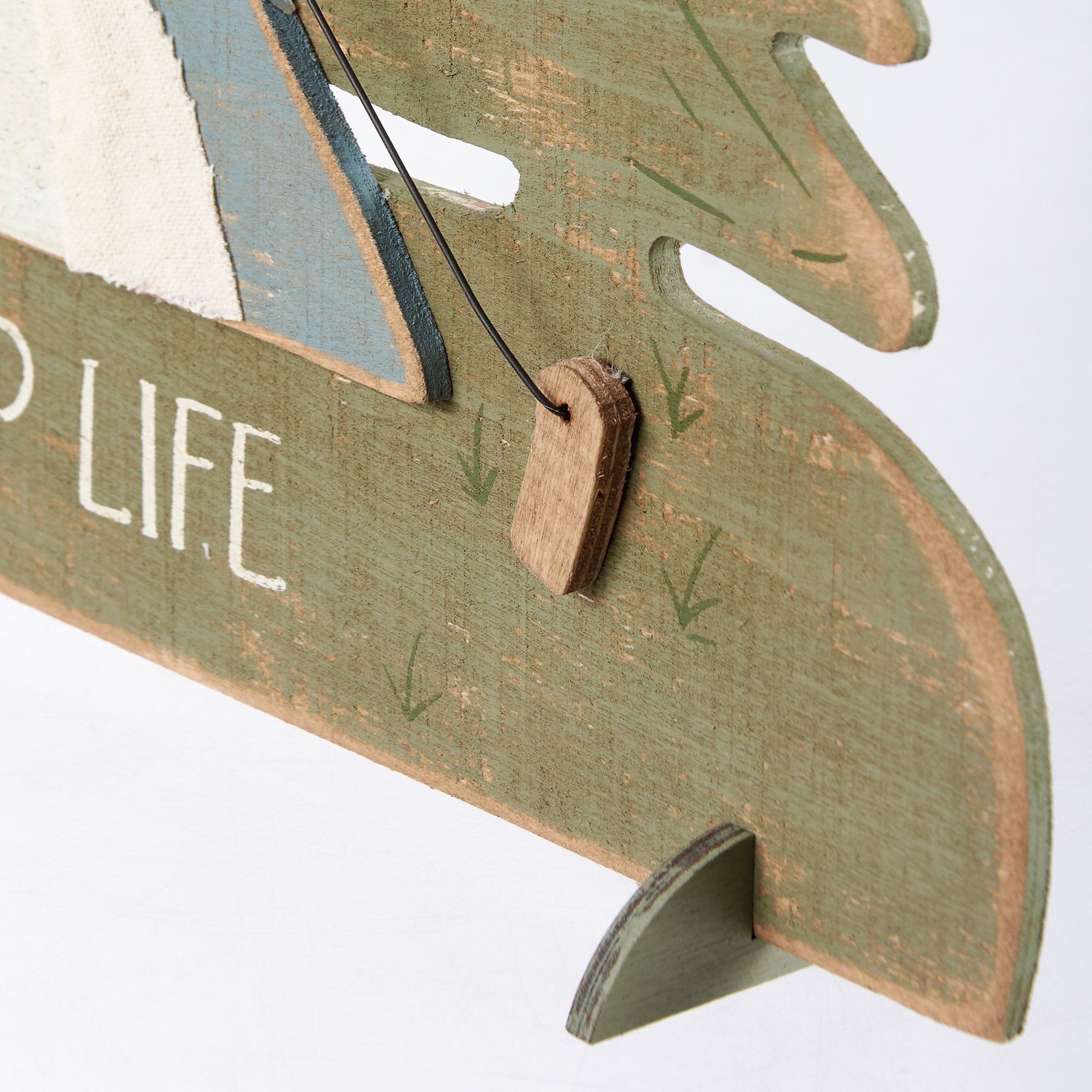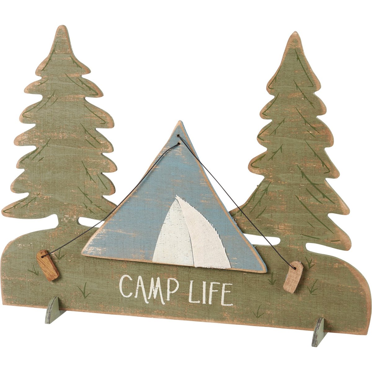 A wooden wall décor piece from our Lake & Cabin Collection featuring wood cutouts placed together to create a scene of a tent in the woods with "Camp Life" sentiment on the bottom. Our Camp Life wall décor is easy to hang via the attached sawtooth hanger or sit using included stands.. A charming everyday home accent perfect for an outdoor theme.