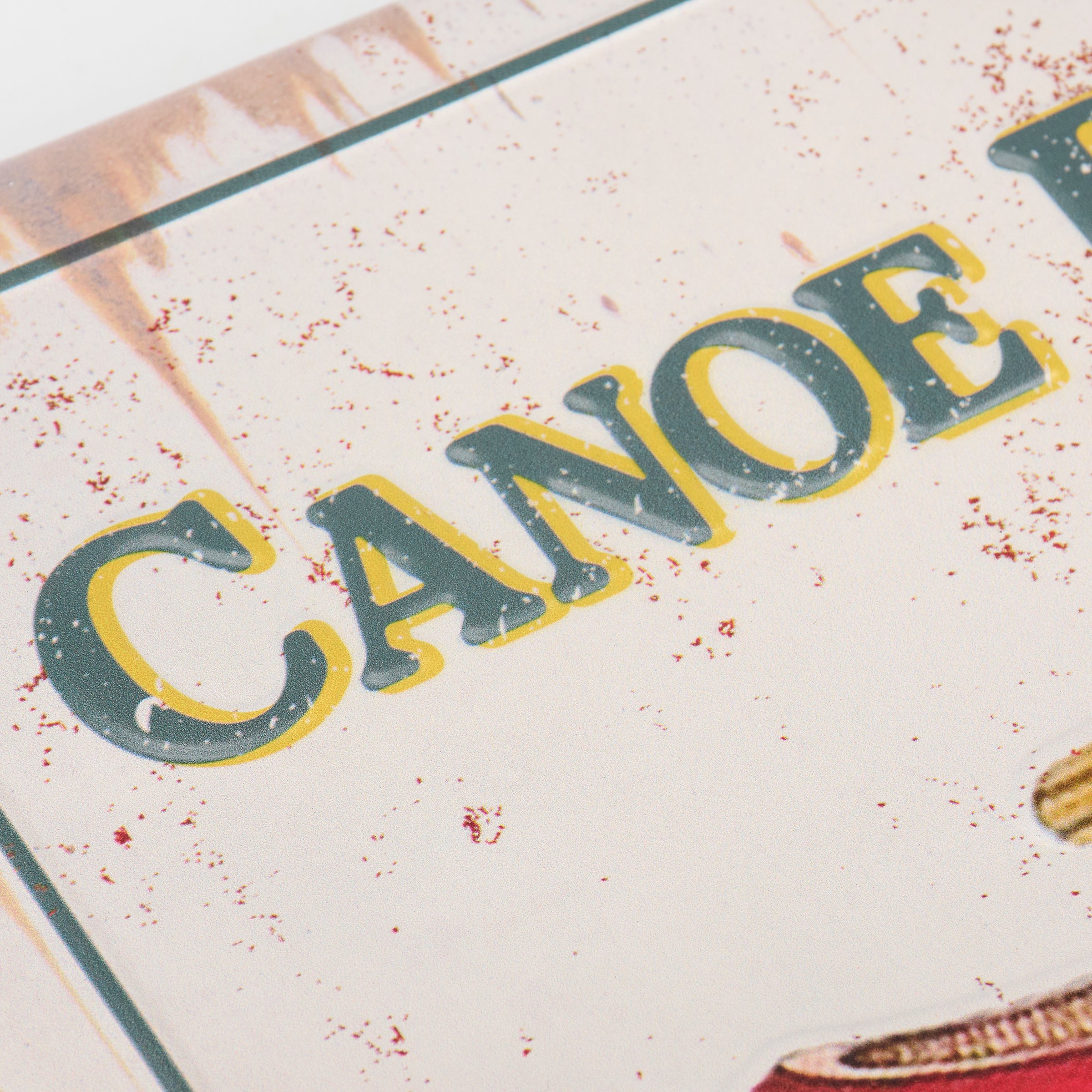 A metal wall décor piece from our Lake & Cabin Collection featuring a rustic camp sign design displaying a "Canoe Rentals - Daily Or Hourly" sentiment with various canoe graphics. Camp sign design features embossed details and a rust finish for an aged appearance. Our Canoe Rentals metal wall décor is easy to hang against wall using the included mounting hardware and pre-drilled holes in each corner. A rustic camping themed home accent that coordinates well with cabin decor.