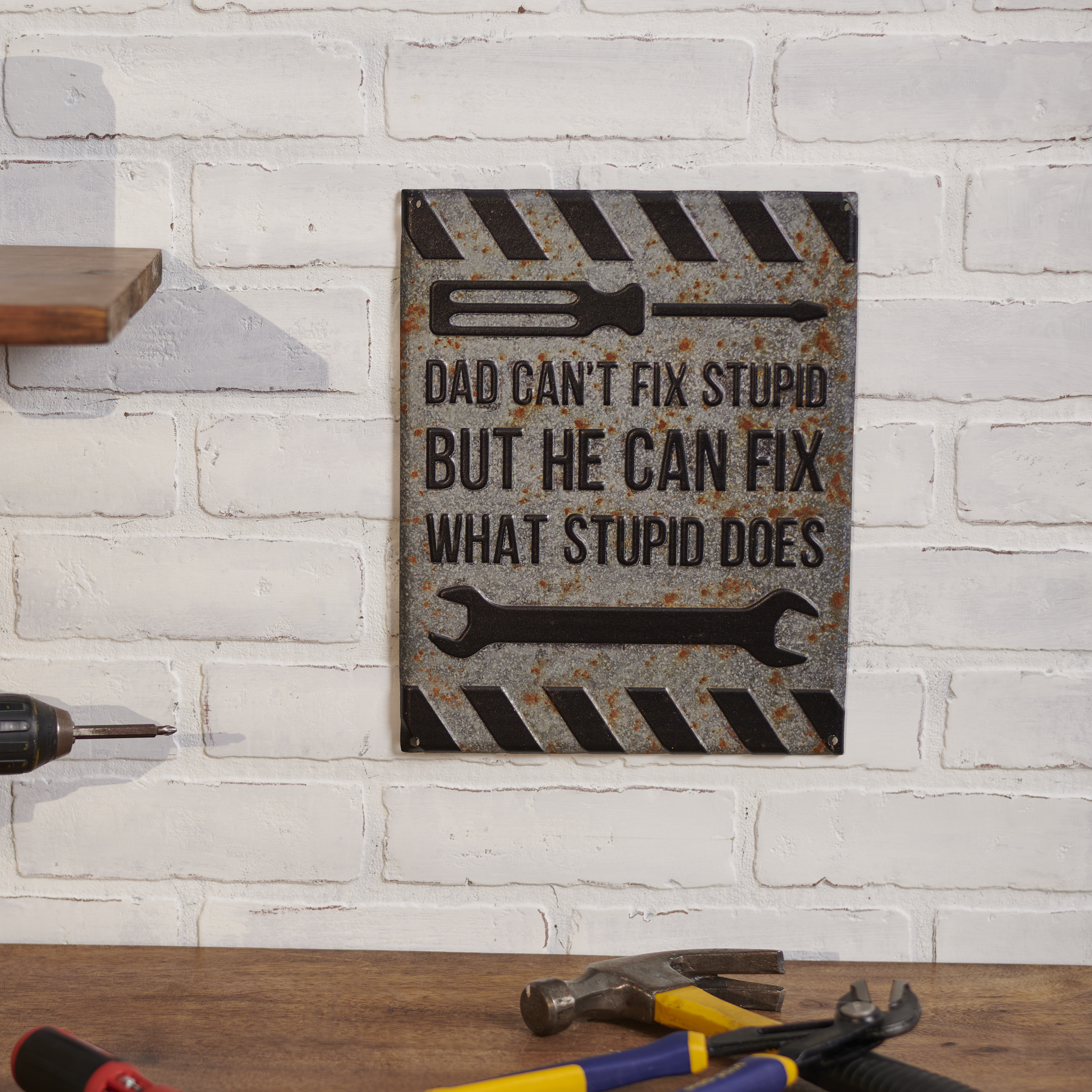 A metal wall décor piece from our Father's Day Collection displaying a work sign design surrounding a humorous dad-themed sentiment that reads "Dad Can't Fix Stupid But He Can Fix What Stupid Does." Design features embossed details as well as rust finish for an aged appearance. Our Can't Fix Stupid wall décor is easy to display using the included nails and holes in each corner. A fun dad-themed gift for an everyday home accent.