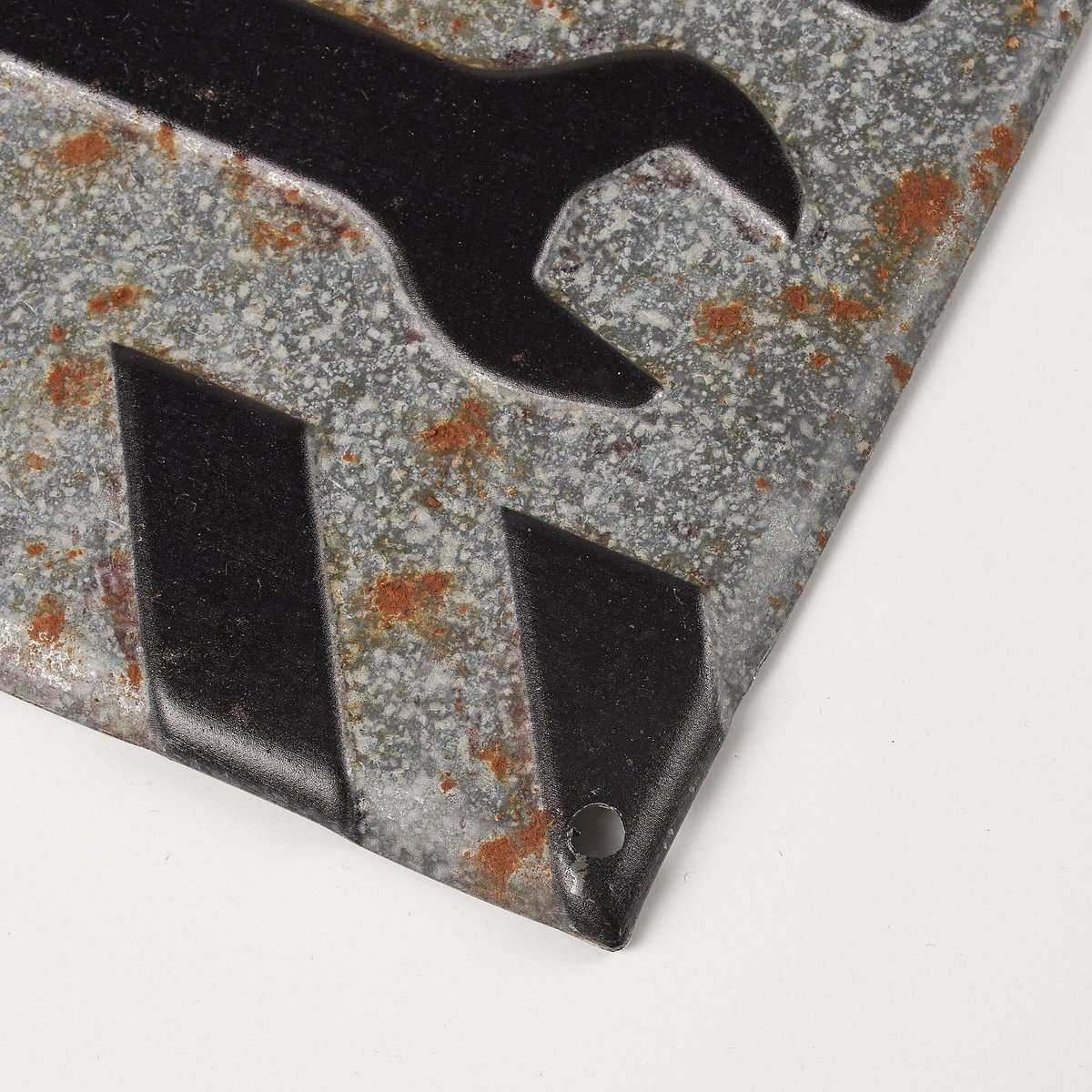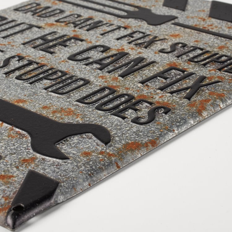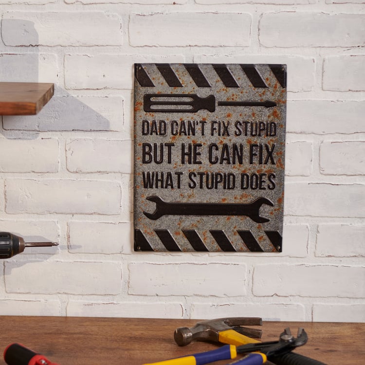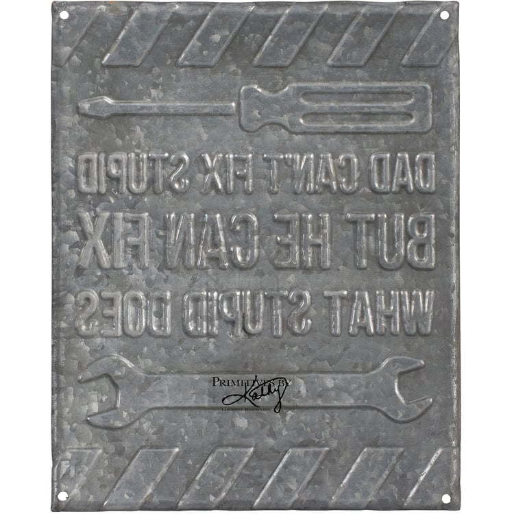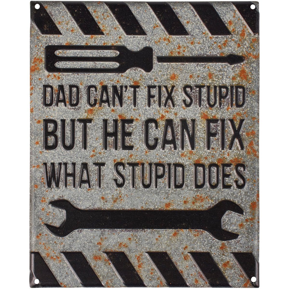 A metal wall décor piece from our Father's Day Collection displaying a work sign design surrounding a humorous dad-themed sentiment that reads "Dad Can't Fix Stupid But He Can Fix What Stupid Does." Design features embossed details as well as rust finish for an aged appearance. Our Can't Fix Stupid wall décor is easy to display using the included nails and holes in each corner. A fun dad-themed gift for an everyday home accent.