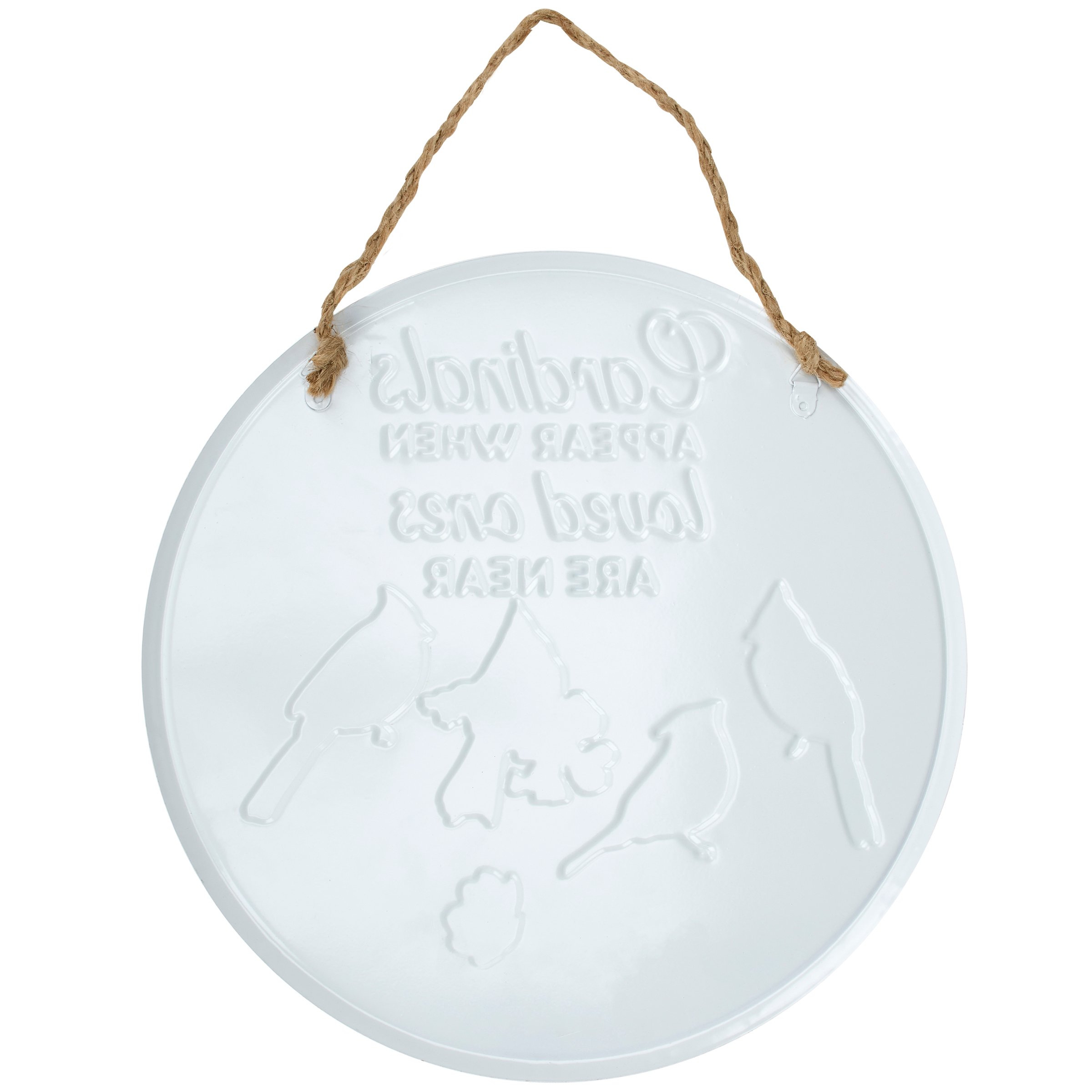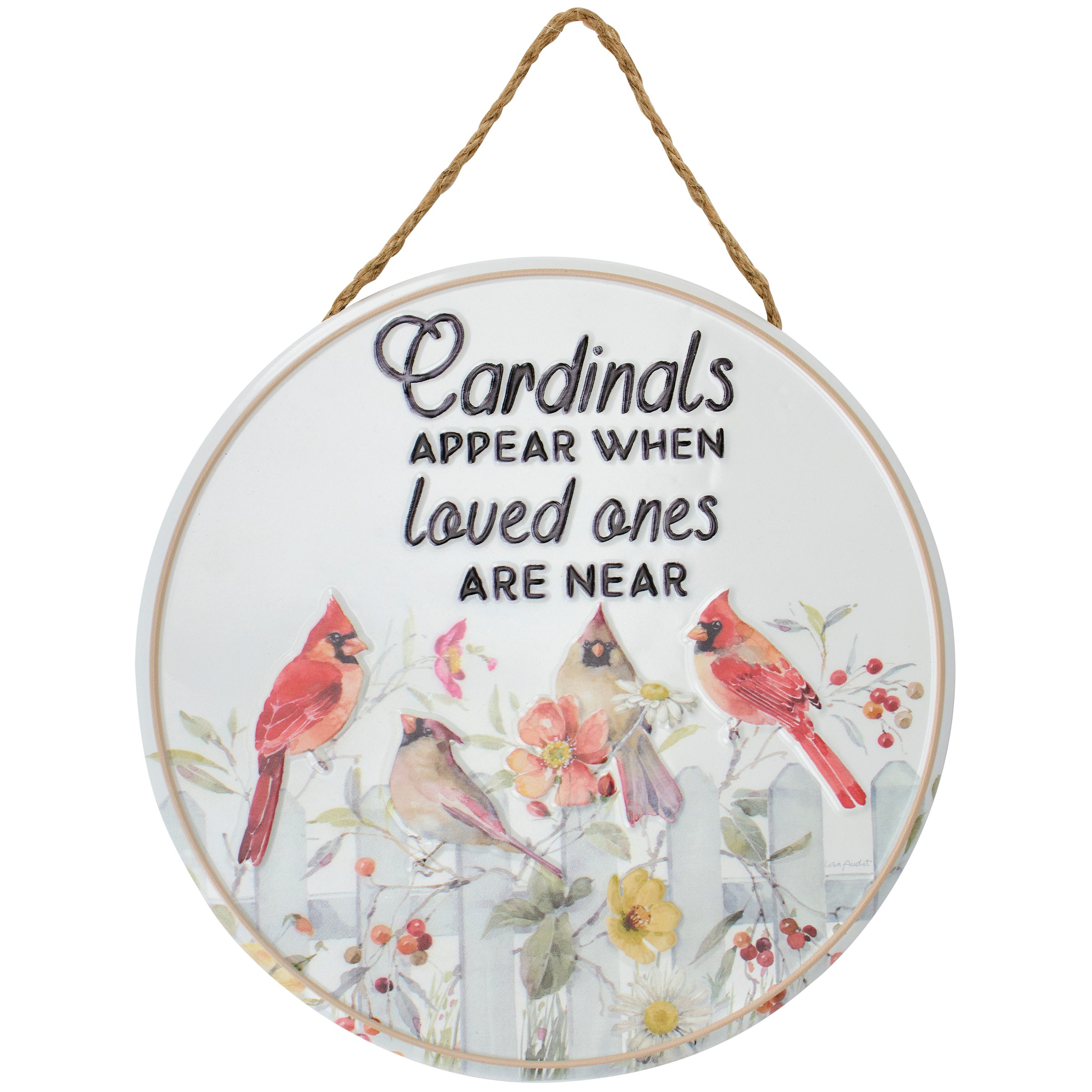 A metal wall décor piece from our Botanical Collection displaying a charming scene of cardinals perched on a fence with summer flowers below an inspirational sentiment that reads "Cardinals Appear When Loved Ones Are Near." Everyday cardinals design is replicated from original art hand painted in a delicate watercolor style with embossed details for added dimension. Our Cardinals Appear Loved Ones Near metal wall décor is easy to hang against wall for display via the attached jute rope hanger. A cardinal themed home accent perfect for everyday display.