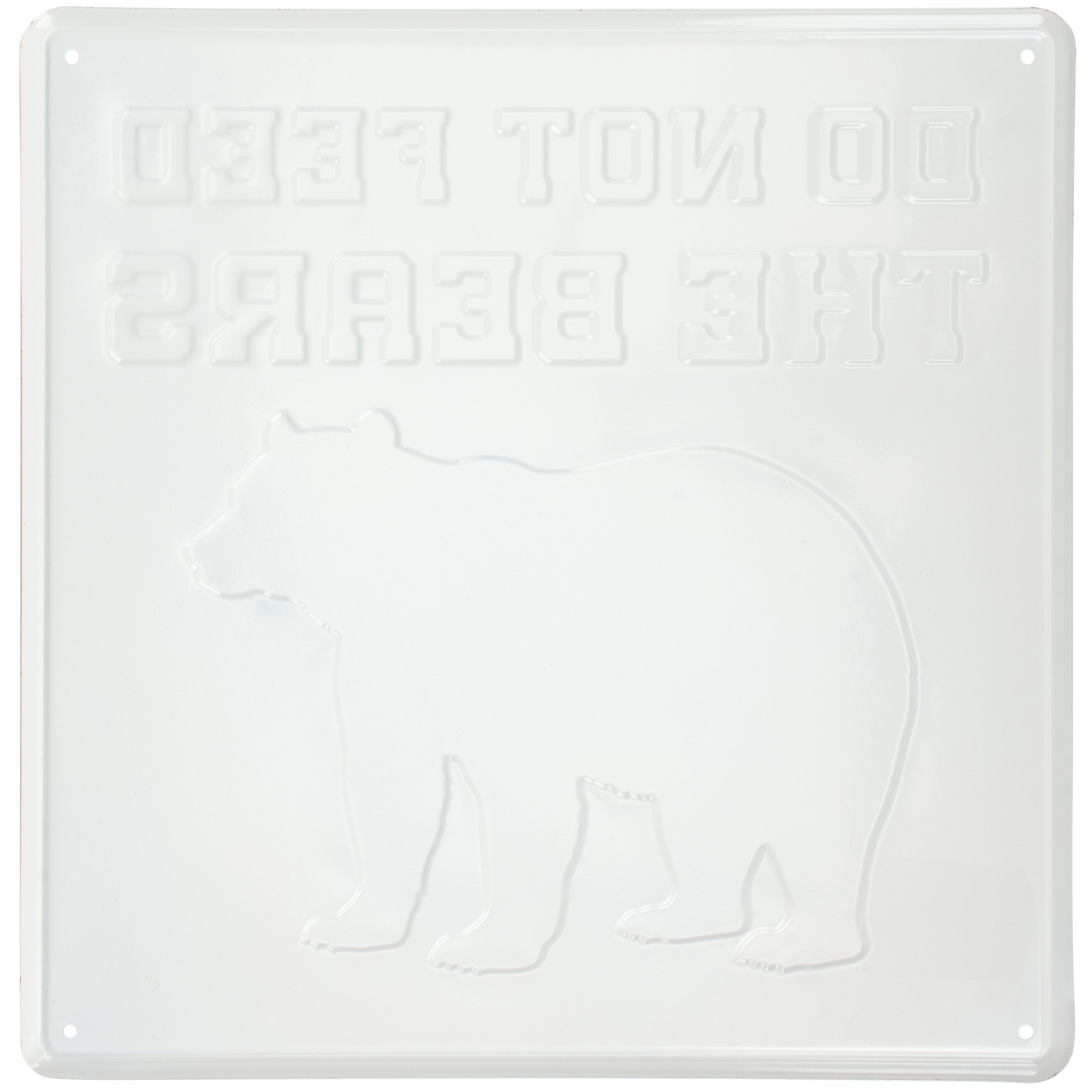 A metal wall décor piece from our Lake & Cabin Collection featuring a rustic camp sign design displaying a "Do Not Feed The Bears" sentiment and a bear graphic underneath. Camp sign design features embossed details and a rust finish for an aged appearance. Our Do Not Feed The Bears metal wall décor is easy to hang against wall using the included mounting hardware and pre-drilled holes in each corner. A rustic camping themed home accent that coordinates well with cabin decor.