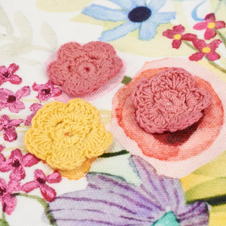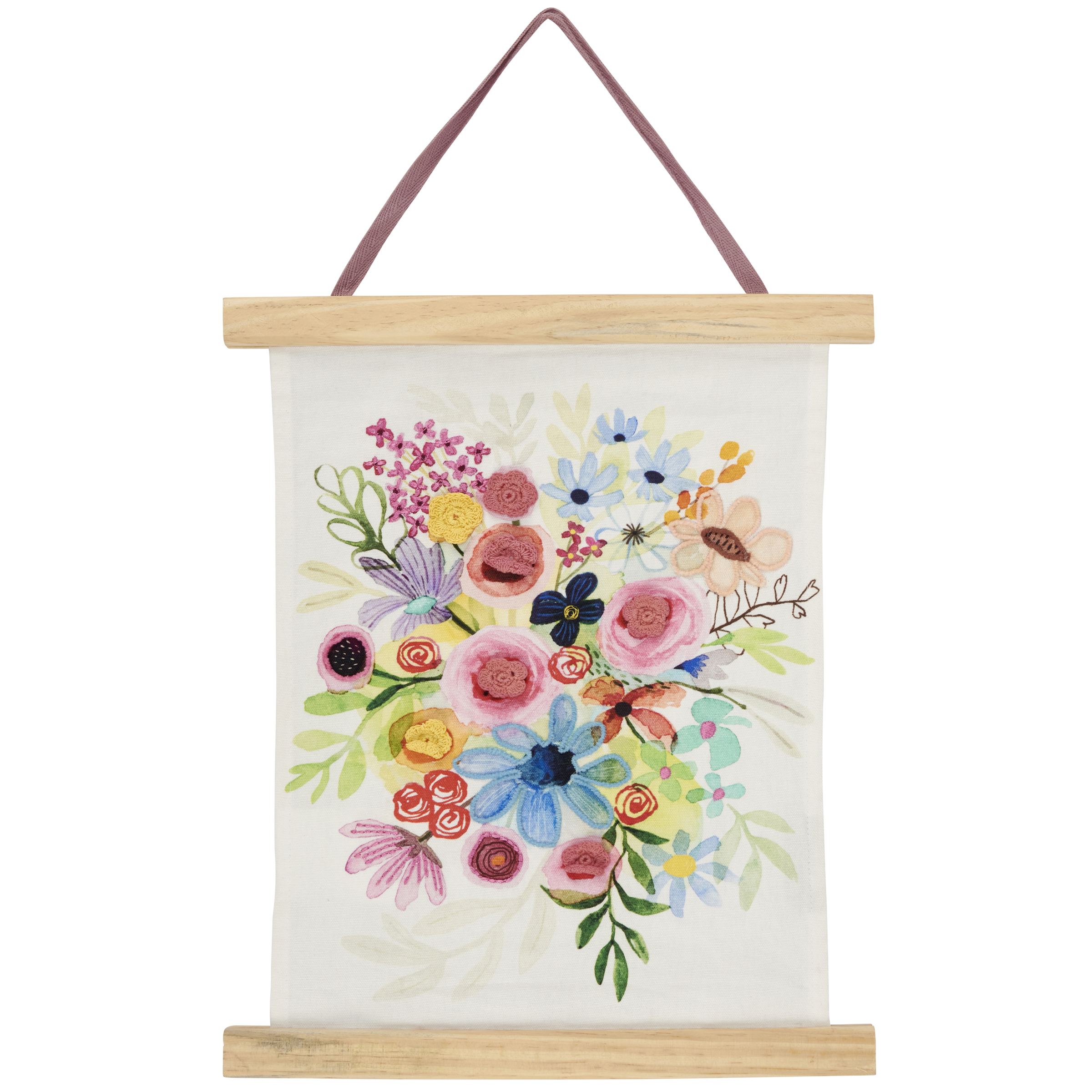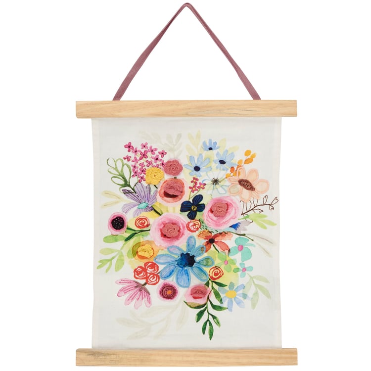 A wall décor piece from our Botanical Collection displaying vibrant hand illustrated floral designs with embroidered accents on canvas stretched between two wooden borders. Our Floral Bouquet wall décor is easy to hang for display via attached cotton tape hanger. A stylish floral-themed home accent perfect for everyday display.