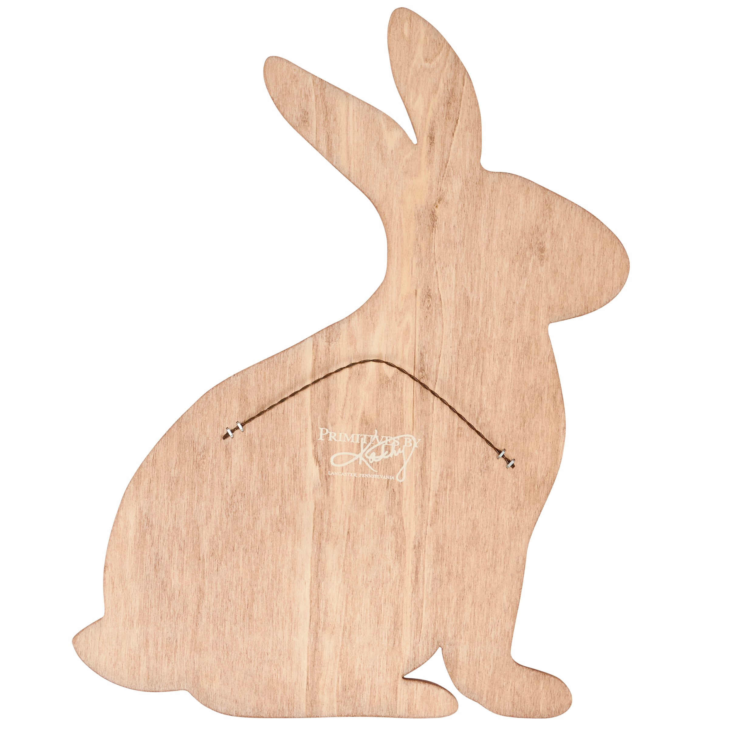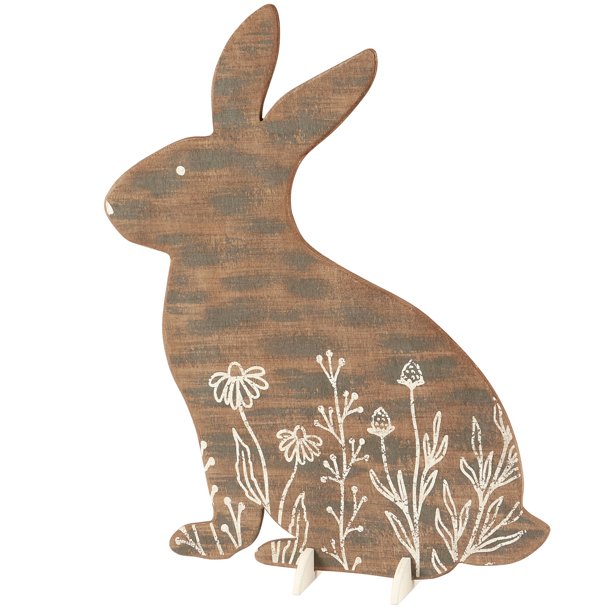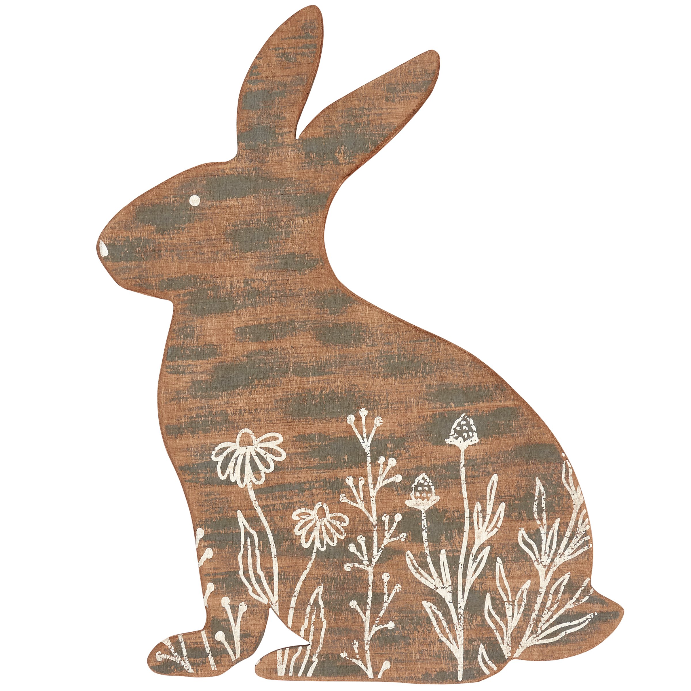 A wooden wall décor piece from our Easter & Spring Collection displaying a natural wood cutout of a sitting bunny with painted floral details. Our Floral Bunny wall décor is easy to display on wall via attached wire hanger or can free-stand using the included removable stands. A rustic spring-themed home accent perfect for adding seasonal style to any room.
