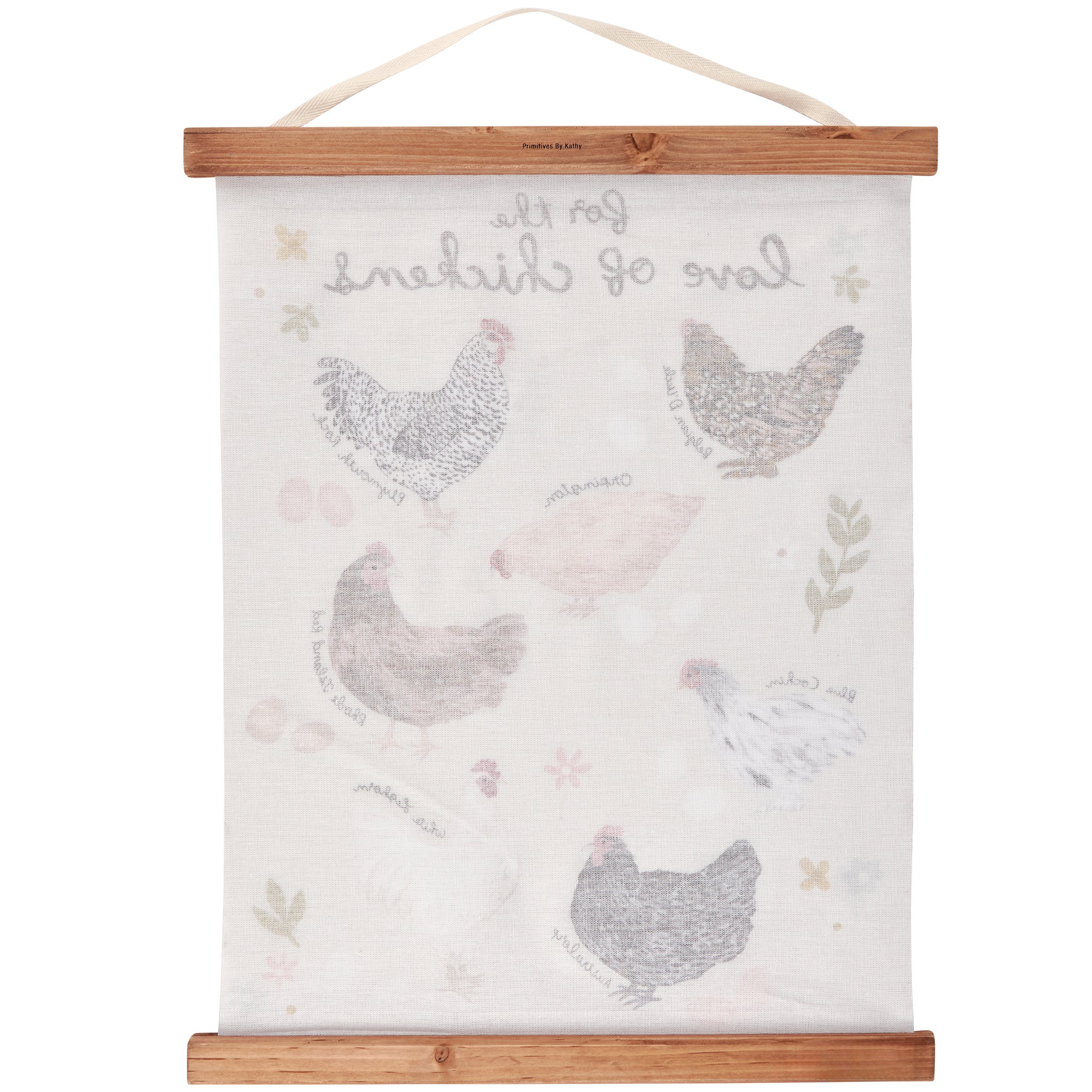 A wall décor piece from our Homestead Collection displaying hand illustrated designs of chickens with breed names and "For The Love Of Chickens" sentiment on canvas stretched between two wooden borders. Our Love Of Chickens wall décor is easy to hang for display via attached cotton tape hanger. A fun farm-themed home accent perfect for everyday display.