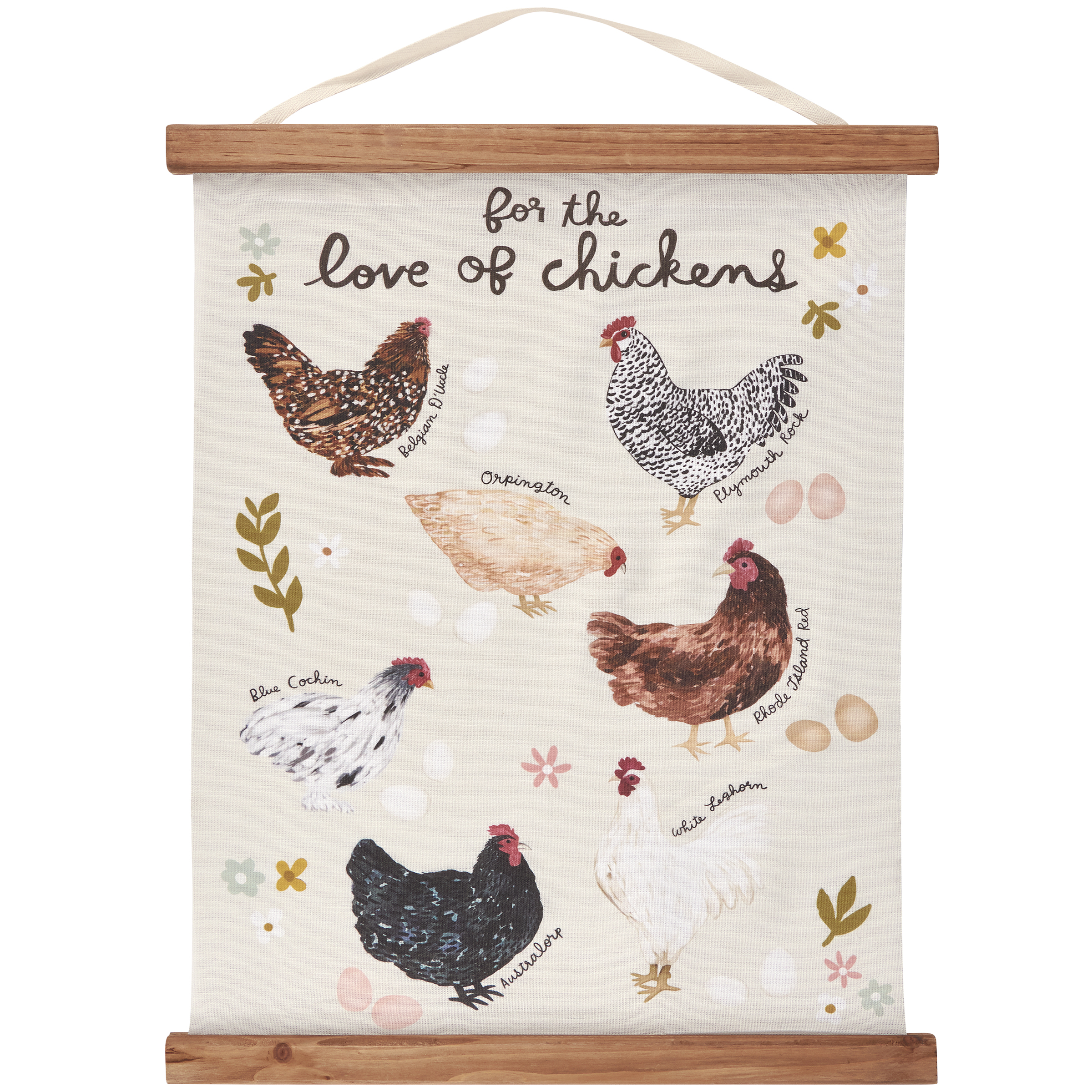 A wall décor piece from our Homestead Collection displaying hand illustrated designs of chickens with breed names and "For The Love Of Chickens" sentiment on canvas stretched between two wooden borders. Our Love Of Chickens wall décor is easy to hang for display via attached cotton tape hanger. A fun farm-themed home accent perfect for everyday display.