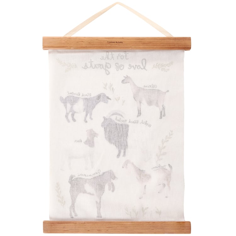 A wall décor piece from our Homestead Collection displaying hand illustrated designs of goats with breed names and "For The Love Of Goats" sentiment on canvas stretched between two wooden borders. Our Love Of Goats wall décor is easy to hang for display via attached cotton tape hanger. A fun farm-themed home accent perfect for everyday display.