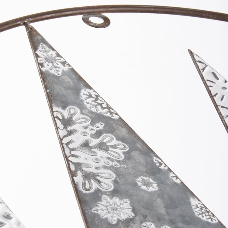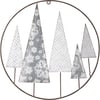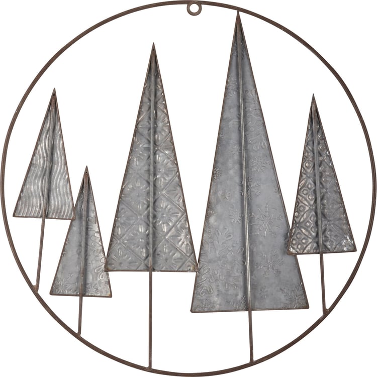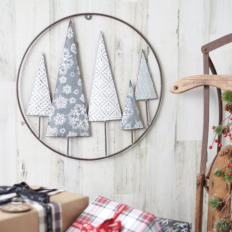 A metal wall décor piece from our bohemian inspired Christmas Collection displaying a variety of uniquely designed trees. The Forest Trees wall décor features five trees with brushed white paint to accent designs all within a round metal ring. Easy to hang via attached ring at the top.